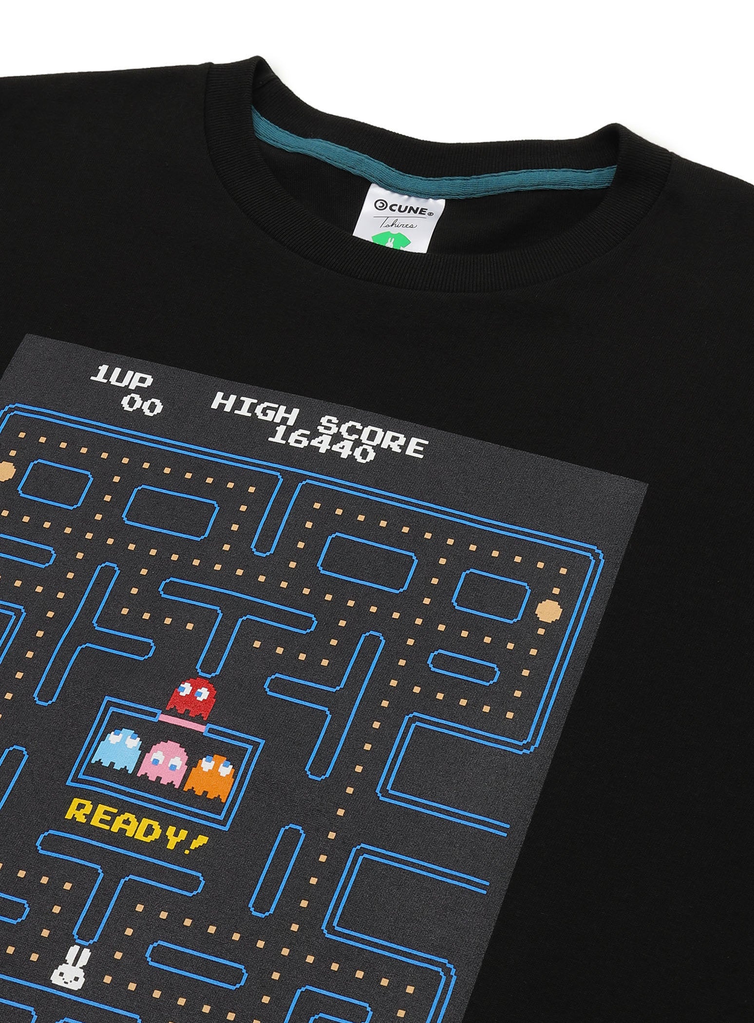 パックマンとコラボしたS/S Tee。左袖のタグとサイズタグのデザインはランダムです。Tシャツサイズ感の確認はこちら。