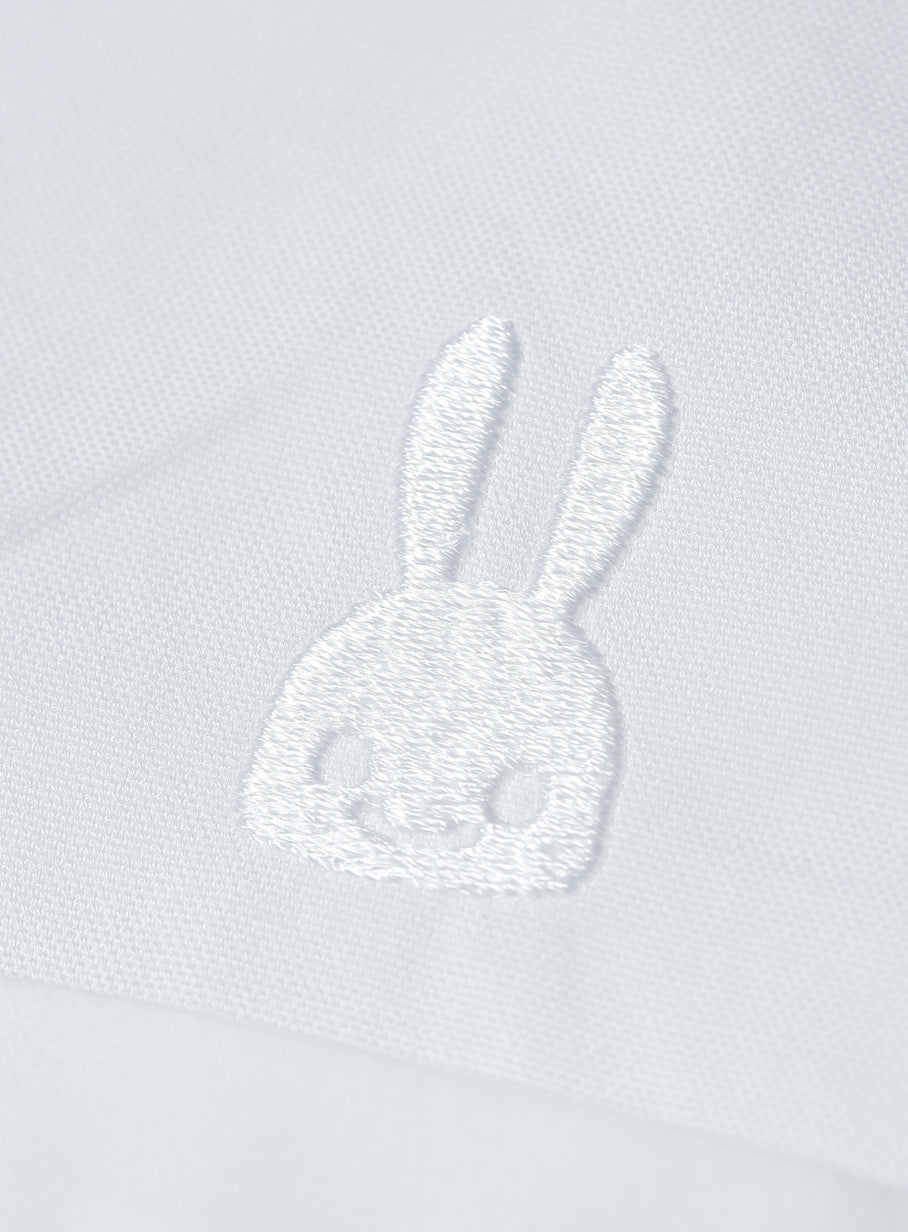 オックスフォードのボタンダウンシャツ。オックス素材を使用しているので洗濯後、アイロンなしでの着用ができます。裾はタックインしても出しても問題ないサイズでカジュアル、フォーマルを問いません。 胸にはウサギ刺繍、裾にはウサギがプリントされています。オリジナルの「シャツのボタン」を使用しています。