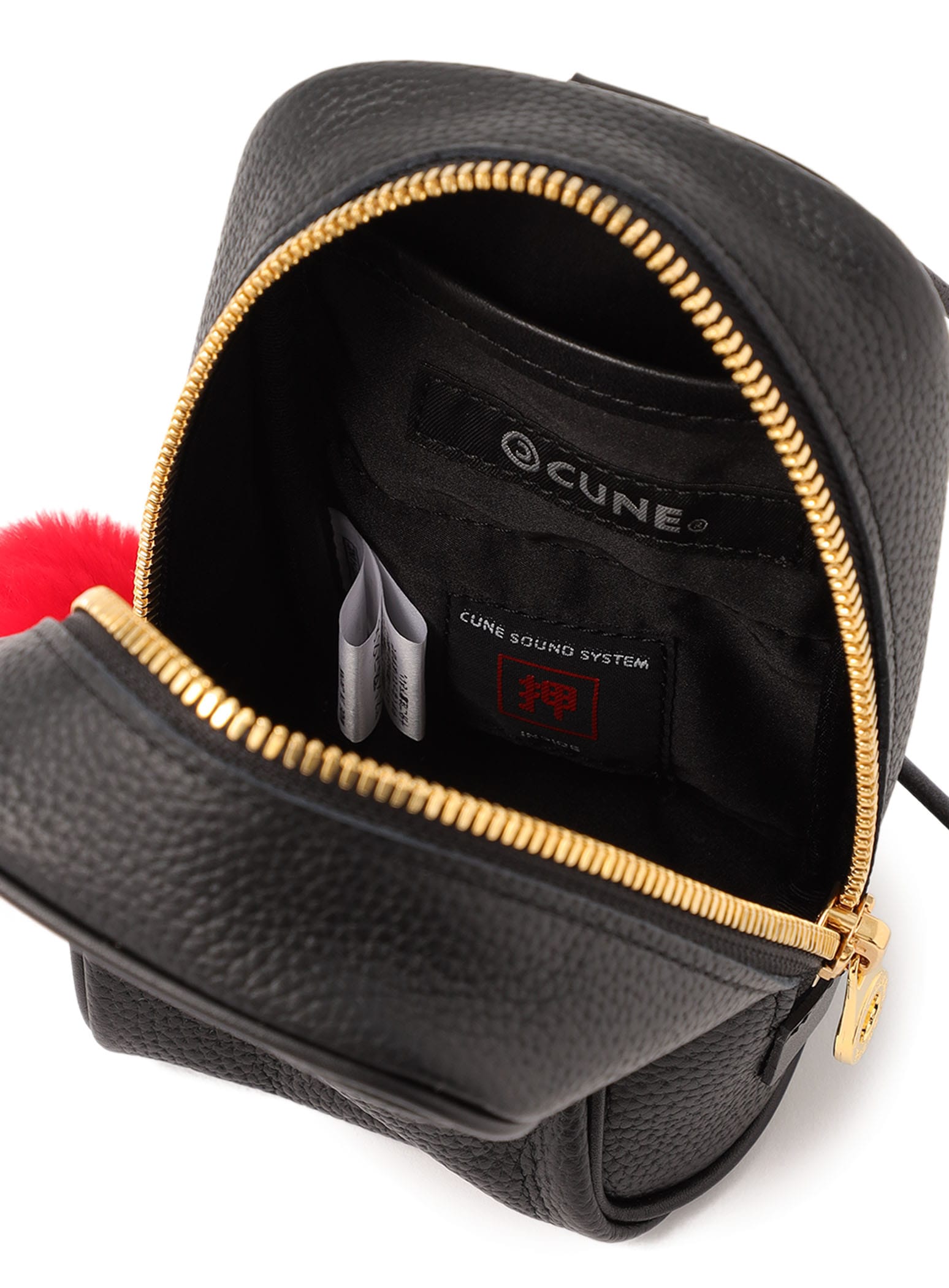 自然なシュリンクでキズが目立ちにくいレザーを使用したポーチバッグ。スライダーにはすごく邪魔なファイクファーのボンボンがついていますが外せます。内ポケットにCSS(CUNE SOUND SYSTEM)を搭載。CSSは縫い込まれているので取り出すことができません。ジップはYKKのEXCELLA?を採用しています。