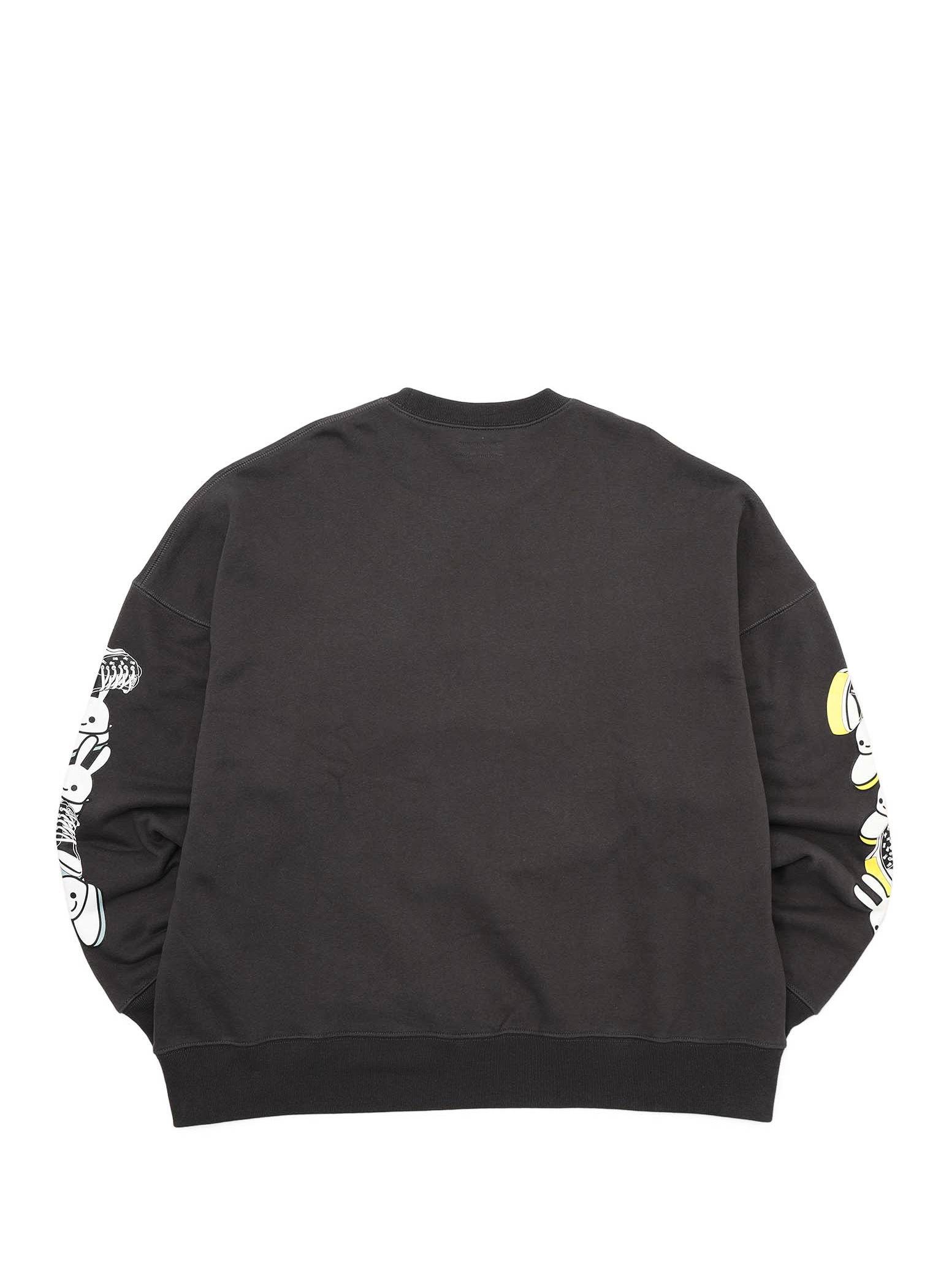 厚手の裏毛を使用したヘヴィウェイトビッグクルーネックスウェット。大きくゆったりとしたシルエットになっています。脇線が前に振られており3本針ロックで縫製されています。脇の下には菱形マチが入っていて動きやすい設計となっています。袖リブはカーブしており前後で高さが違います。肘にはあまり意味のなさそうなダーツが入っています。袖口には小さくうさぎのプリントが入っています。