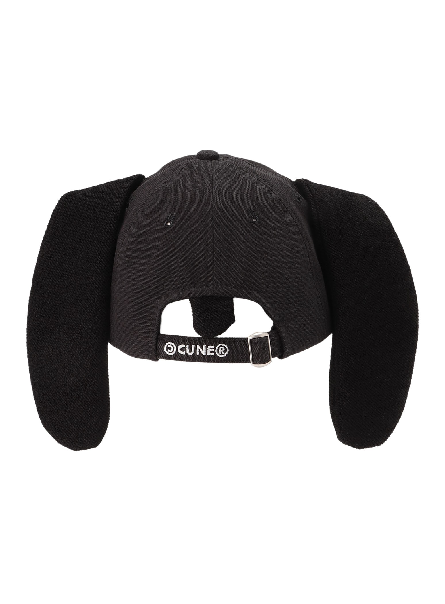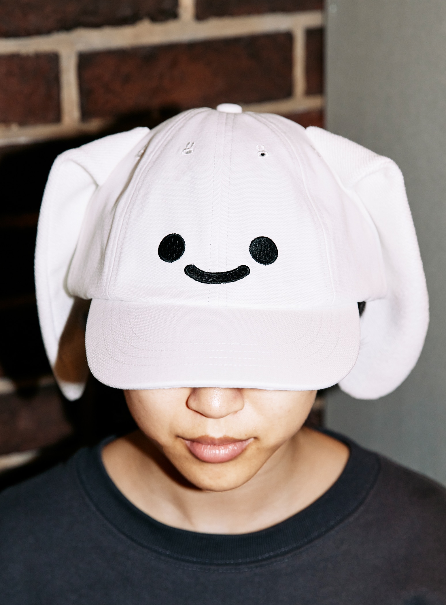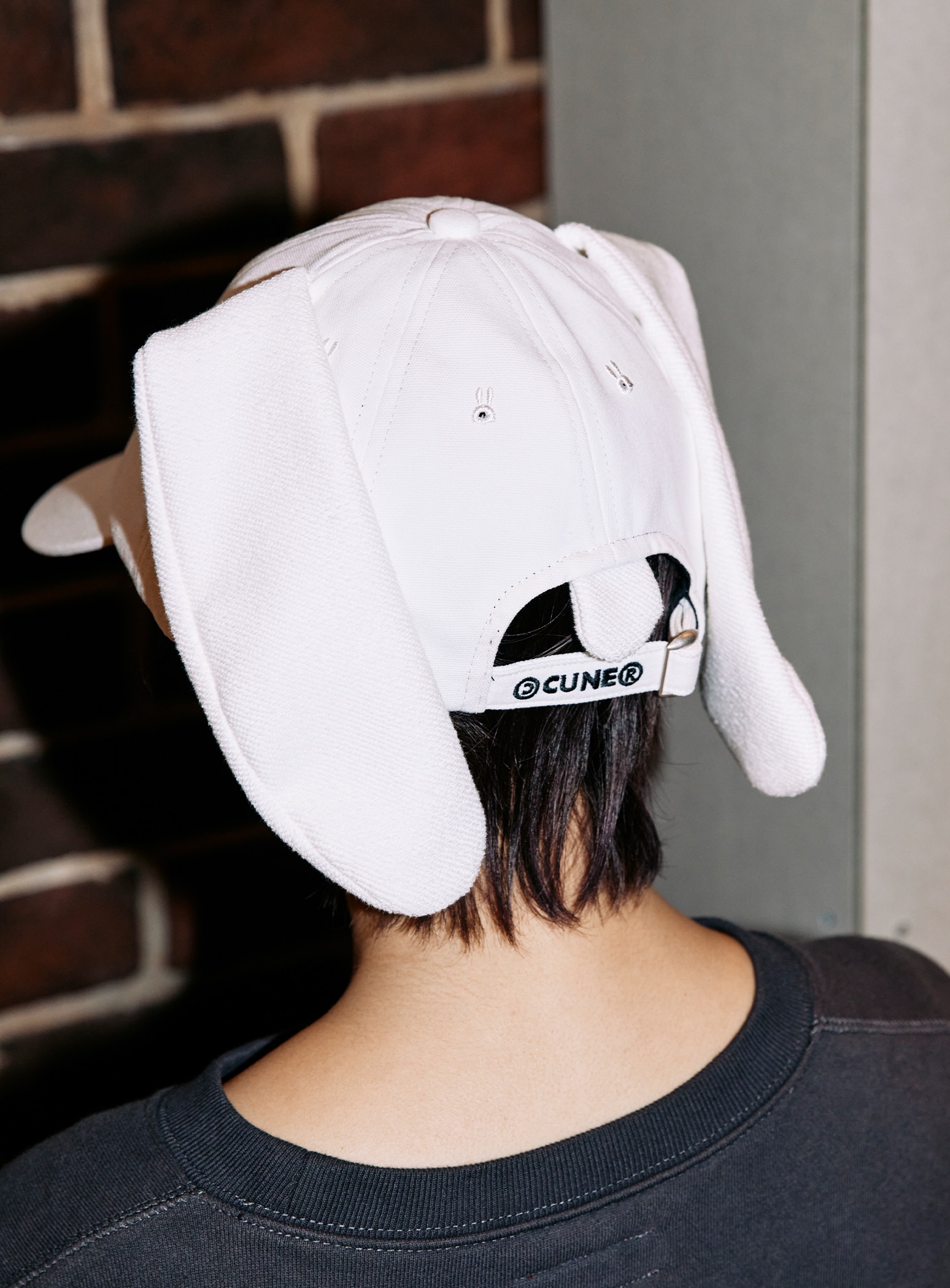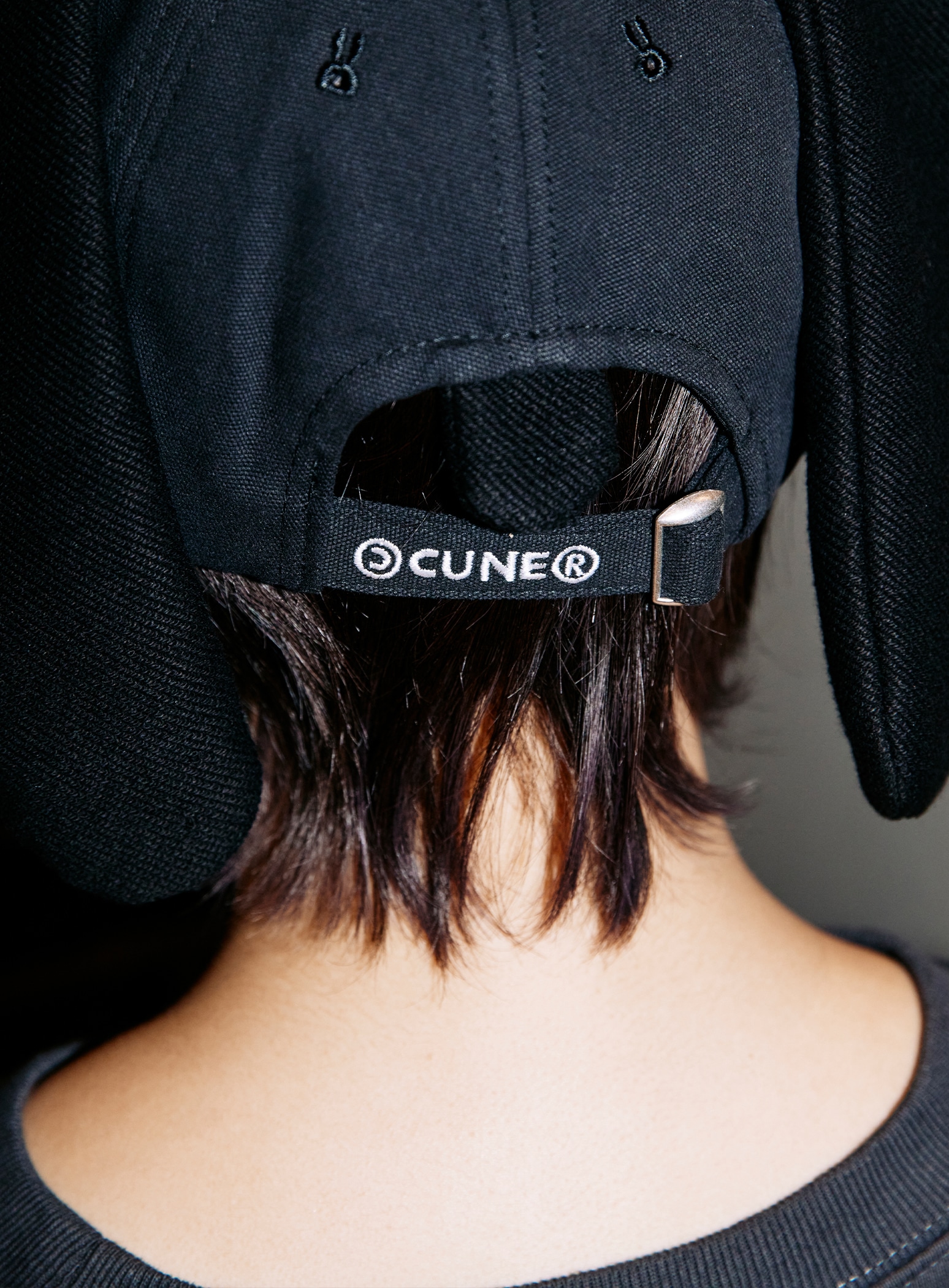 うさぎの耳が付いた8Pキャップ。刺繍を施したアジャスター付きでサイズ調整が可能です。裏面のテープには「ボウシをかぶってごらんなさい」とプリントされています。帽子上部にはウサギの形の菊穴が配置されています。うさぎの耳にはCSS(CUNE SOUND SYSTEM)を採用しています。