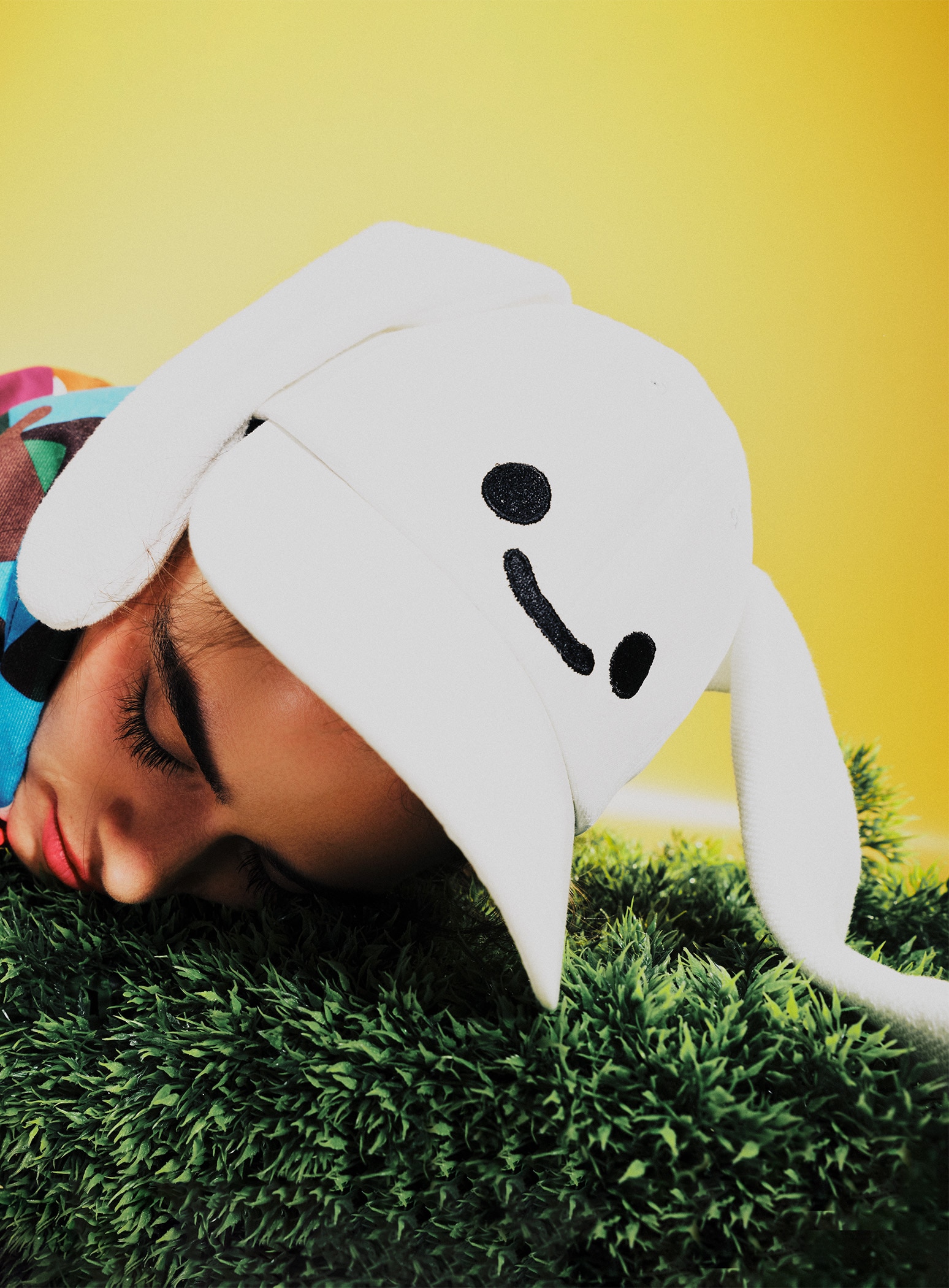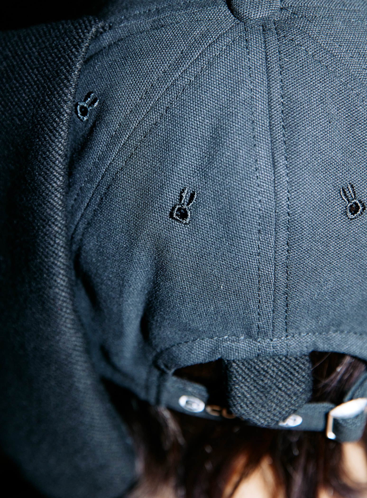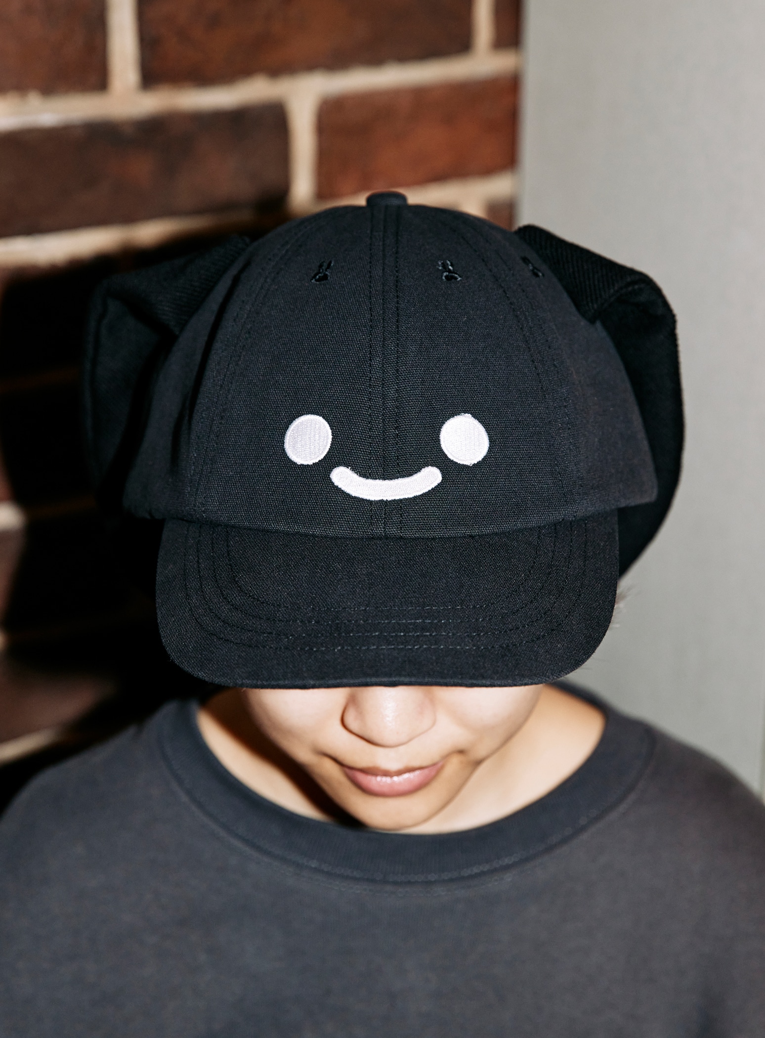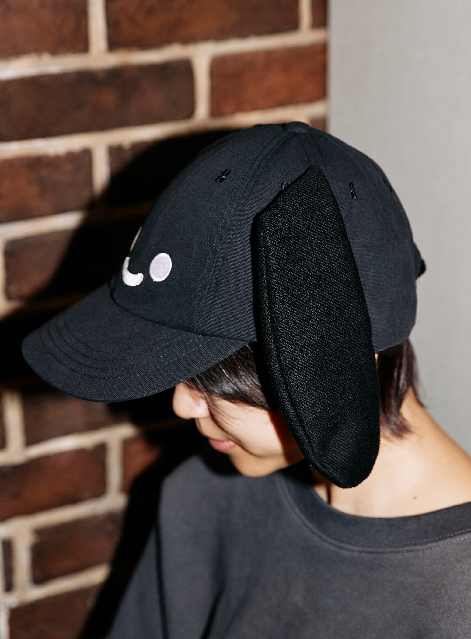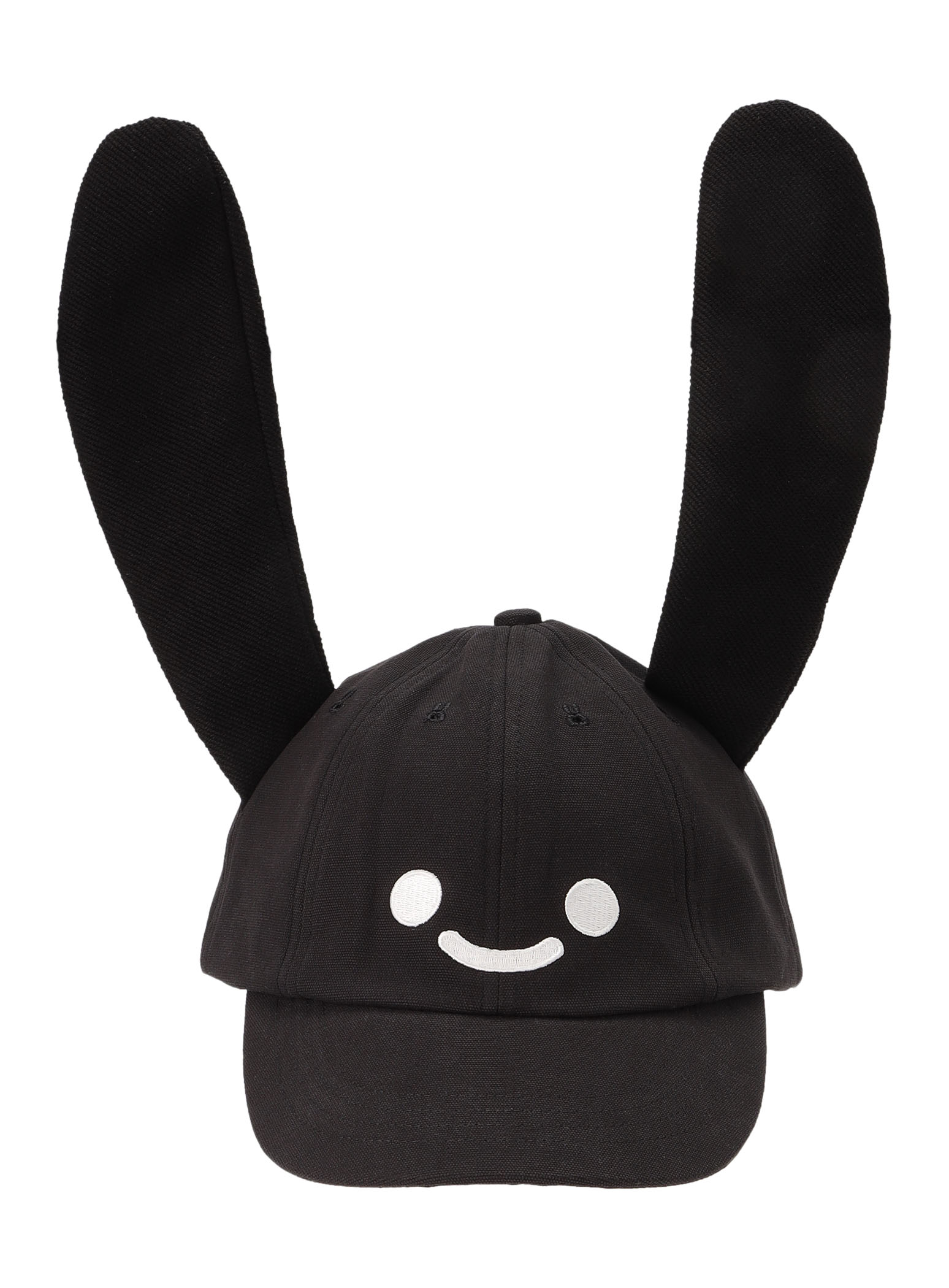 うさぎの耳が付いた8Pキャップ。刺繍を施したアジャスター付きでサイズ調整が可能です。裏面のテープには「ボウシをかぶってごらんなさい」とプリントされています。帽子上部にはウサギの形の菊穴が配置されています。うさぎの耳にはCSS(CUNE SOUND SYSTEM)を採用しています。
