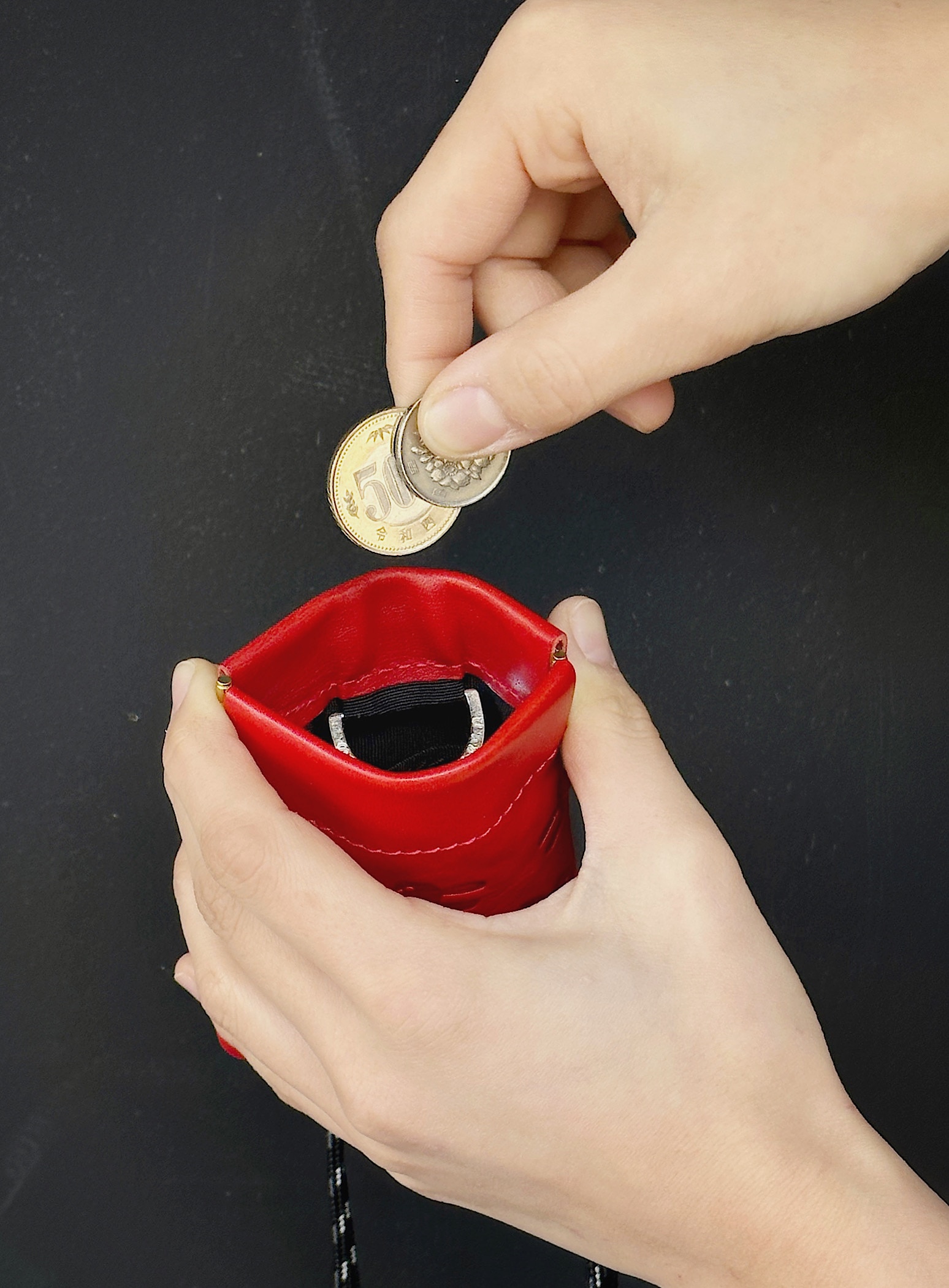 国産皮革「栃木レザー」を使用した首かけマルチケース。両サイドを押すことで口が開きます。内部には仕切りとオリジナルDカンがついています。カードを入れることができるサイズ感です。紐部分は調整ができます。