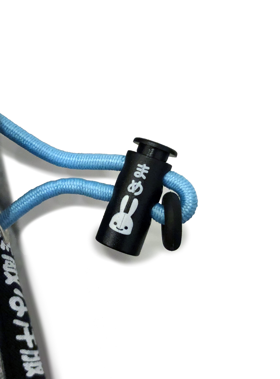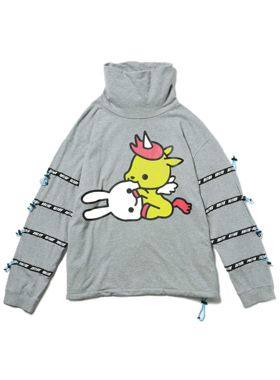 2018A/W コレクションのテーマ「ゴムまめ」を象徴するような袖に横ゴム4本のタートルスウェット。ビックシルエットのタートルネックをベースに、袖には「素敵な洋服」と書かれたテープとドローコードが4本。ドローコードを引っ張ると、生地が吊られてシルエットが変化します。男性でも女性でも着用可能なシルエットに仕上がっています。