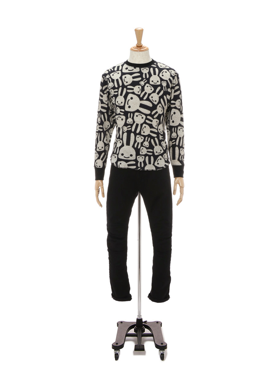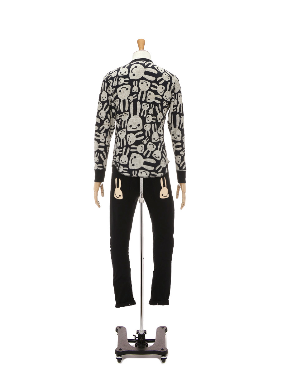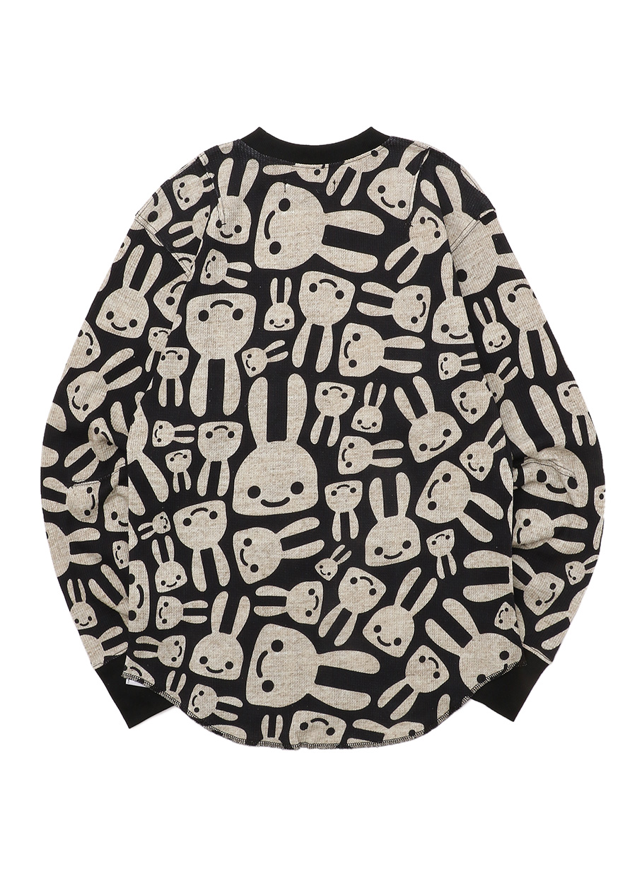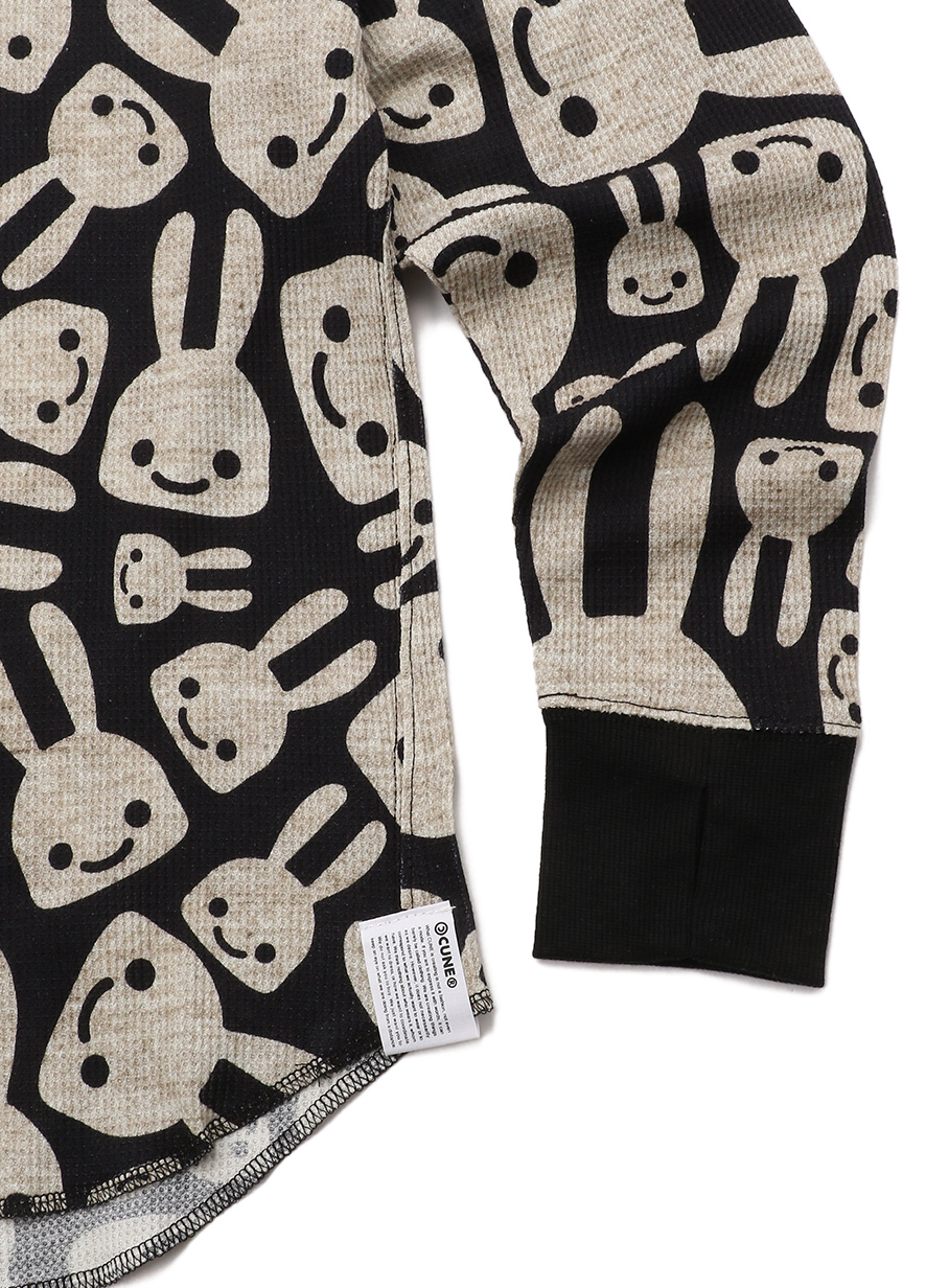 オリジナルプリントを施した綿ワッフル生地を使用したサーマル。袖には肘ダーツを入れています。衿はフライスの付け衿となっており、裾はロック始末になっています。袖口のリブには指穴があいています。