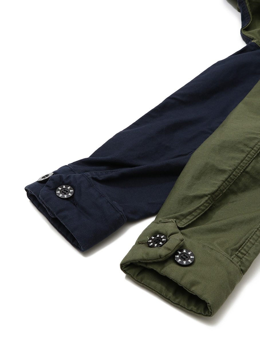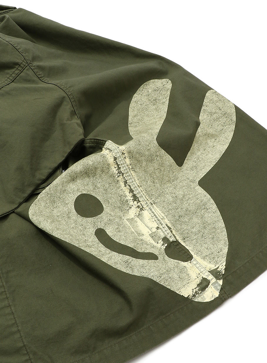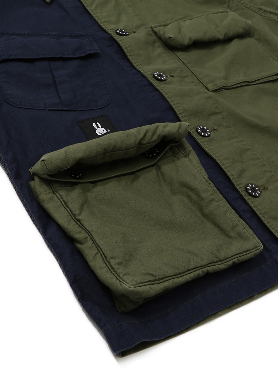 モールスキン素材を使用した腫れぼったいジャケット。襟とポケットのフラップ、袖口に中綿(PRIMALOFT®)が入っているので、少しはれぼったくて暖かいです。21AW専用のピスネームが付いています。バイオ加工を施しているため、パッカリングや、プリントにスレなどがあります。