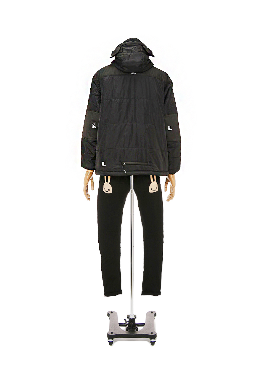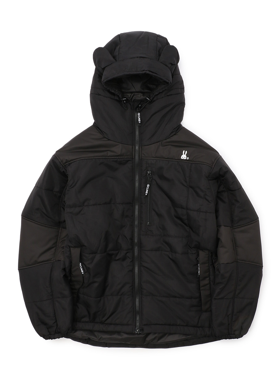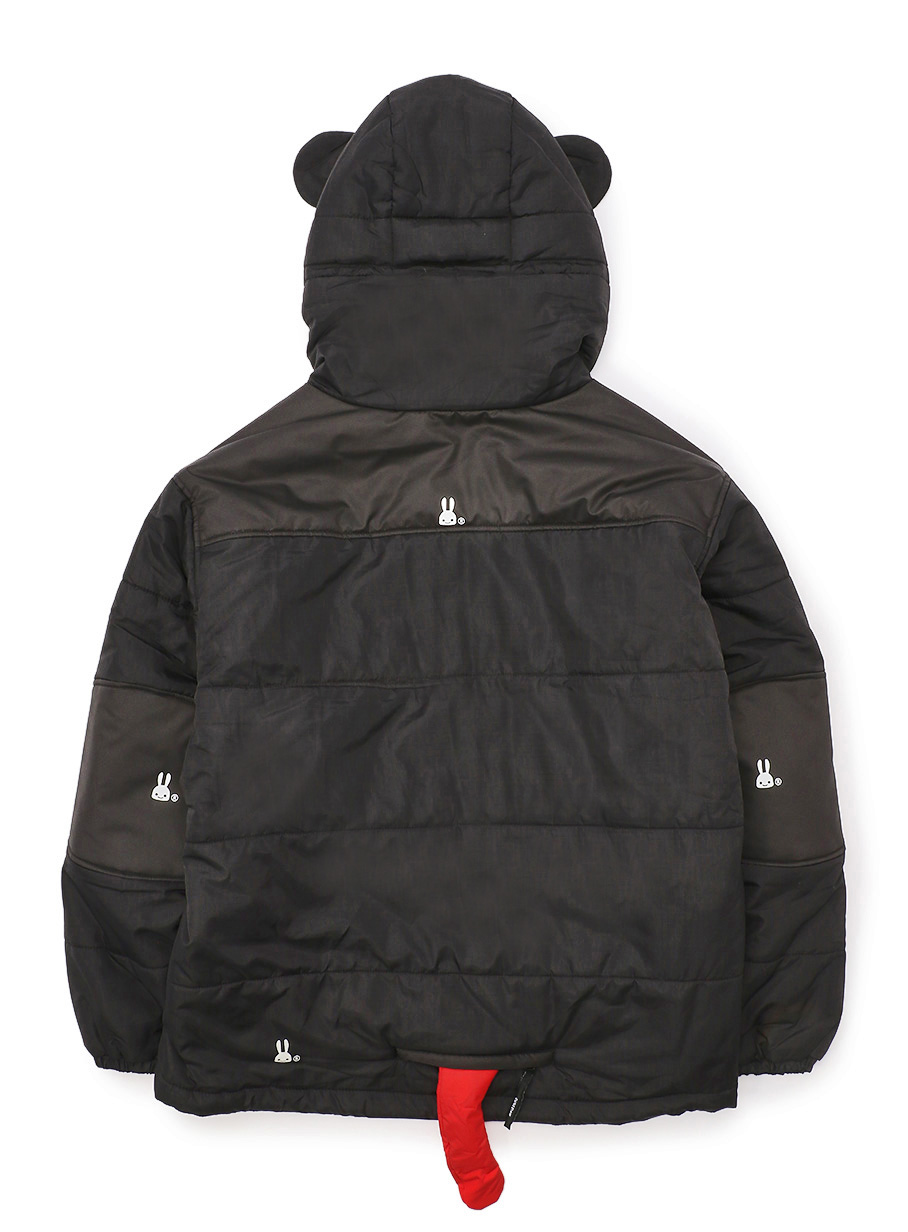 表地に柔らかいナイロンリップ生地を使用したパフジャケット。首をすっぽりと覆う仕様のフード、中綿(PRIMALOFT®)を使用しており、軽くて防寒性に優れたジャケットです。内側には大きめなメッシュポケットが付いており、背面には収納可能な尻尾が付いています。後ろ左裾のプリントはリフレクタープリントになっています。21AW専用のピスネームとリボンテープが付いています。