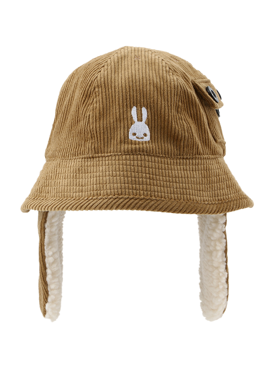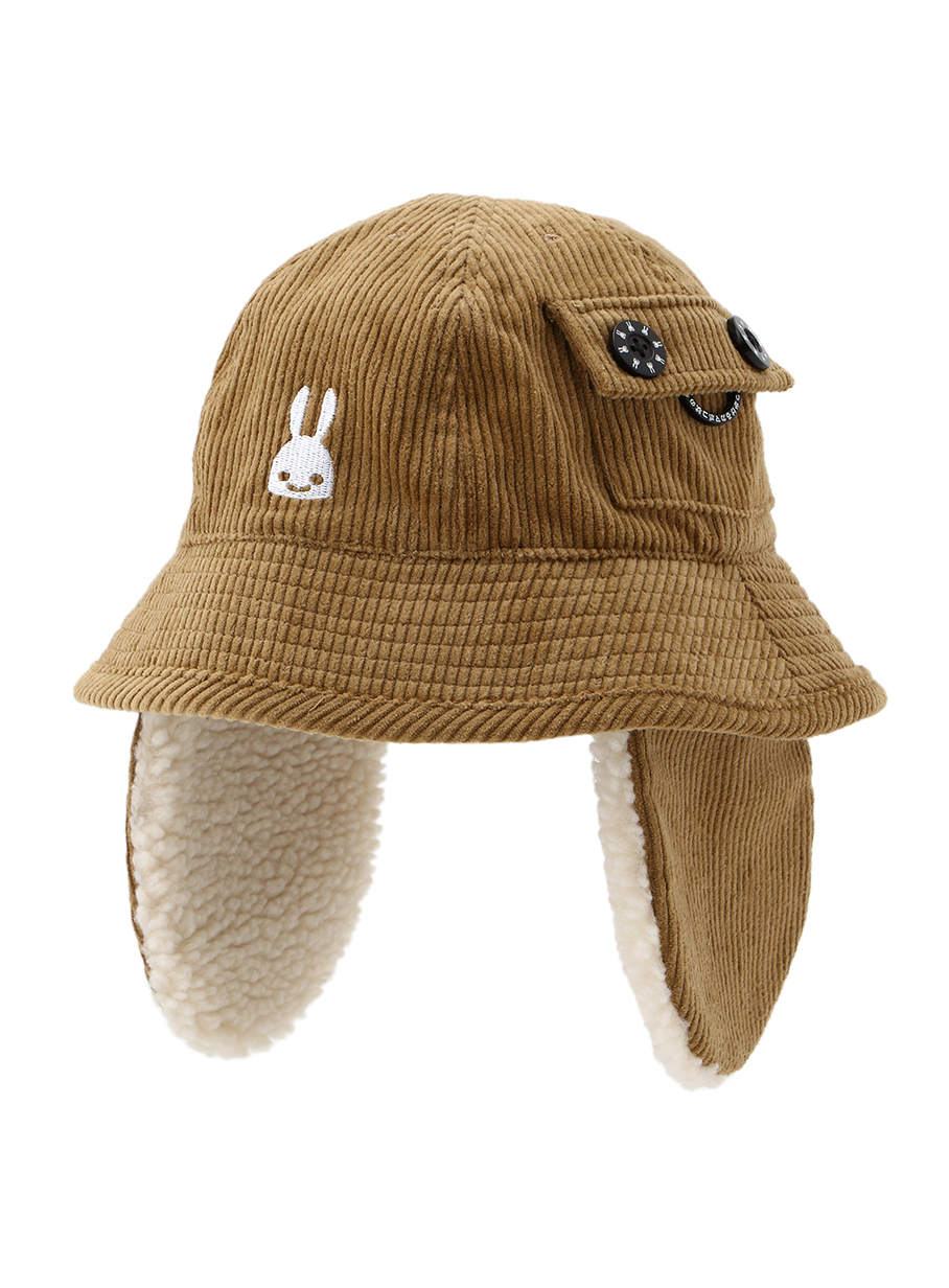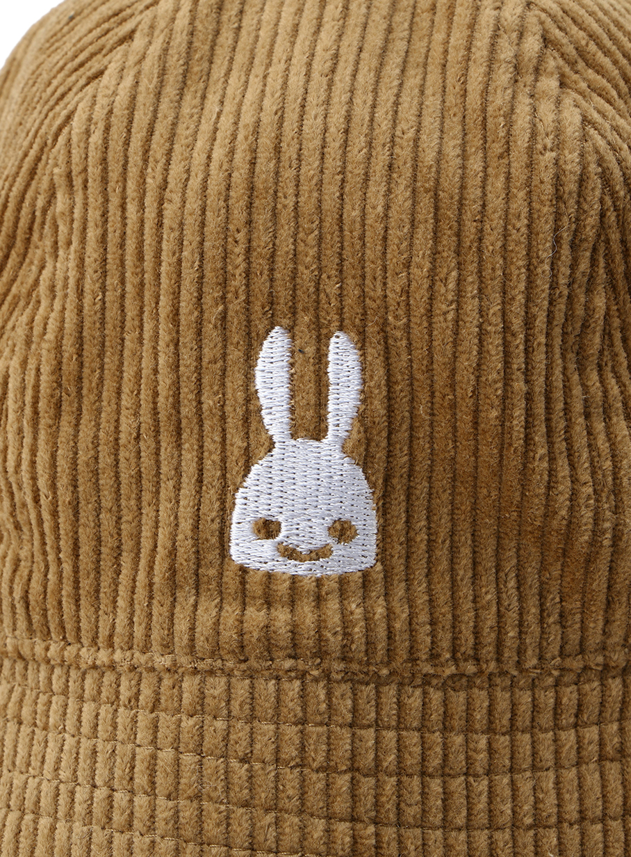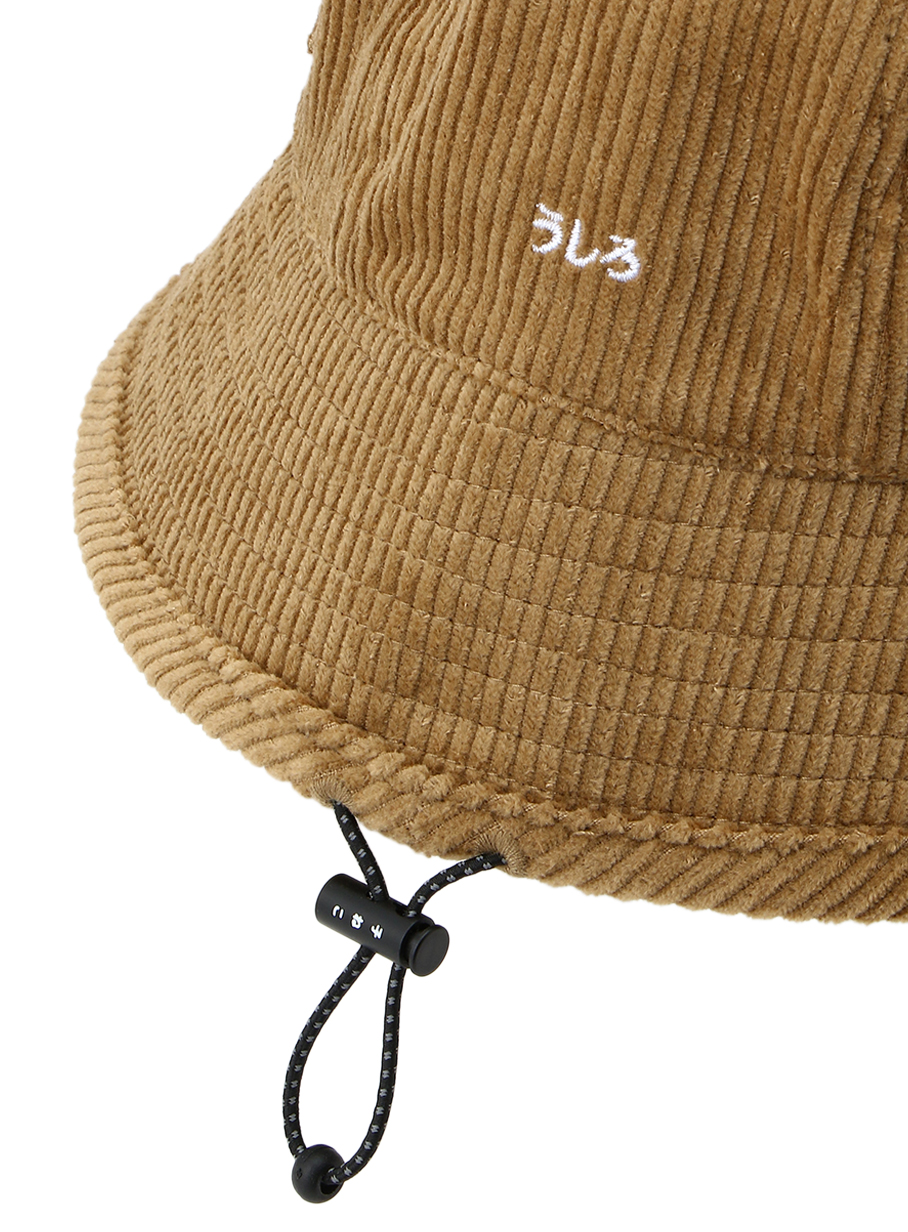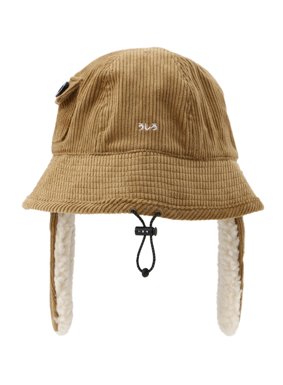 コーデュロイ生地を使用した犬帽子。犬の垂れ耳のような耳当てが付いているのでかぶると犬っぽくなれます。ツバの周りにゴムスピンドルを通してありツバを絞ることが出来ます。脇にはフラップポケットを搭載しています。裏面のテープには「コーデュロイハットをかぶってごらんあそばせ」とプリントされています。