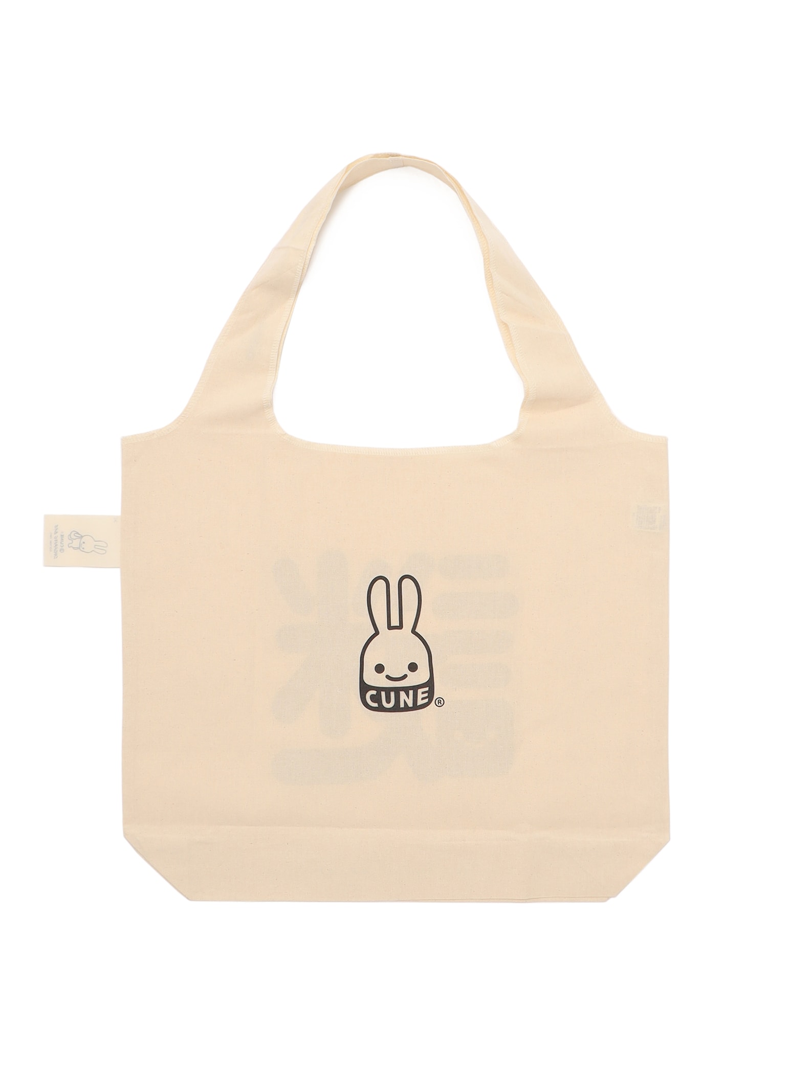 お買い物にちょうど良さそうなショッピングバッグ。バックプリントは共通でCUNEウサギがプリントされています。持ち手部分にはプリント、側面にはネームが付いています。内部はポケットがないシンプルな作りで、底面にはバッグが語りかけているようなプリントがされています。