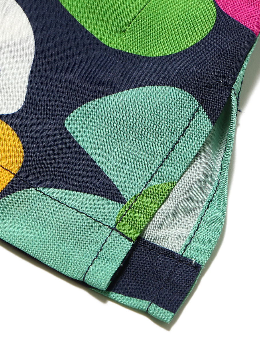 総柄プリントされたアロハシャツ。レーヨン生地を使用しているのでしなやかで気持ちの良い肌触りです。オリジナルウッドボタンを使用しています。前たての一番上にはゴムループがついており、第一ボタンをとめられるようになっています。左胸にはポケットが付いており、身頃のお腹付近には意味がなさそうで若干意味のあるダーツが入っています。 女性にもおすすめです。着用画像はサイズ感の参考のため、色や仕様がお届けの商品と異なります。
