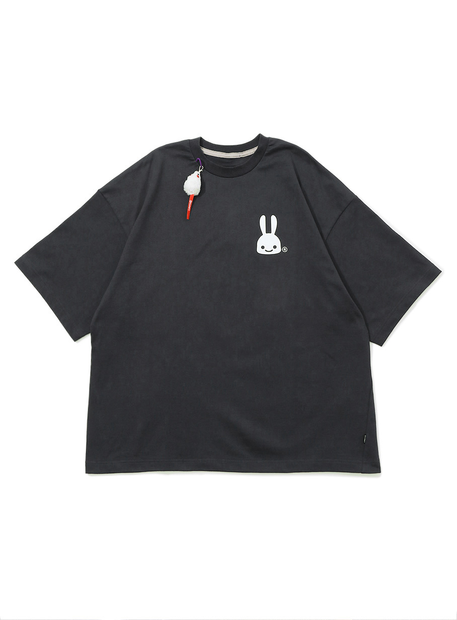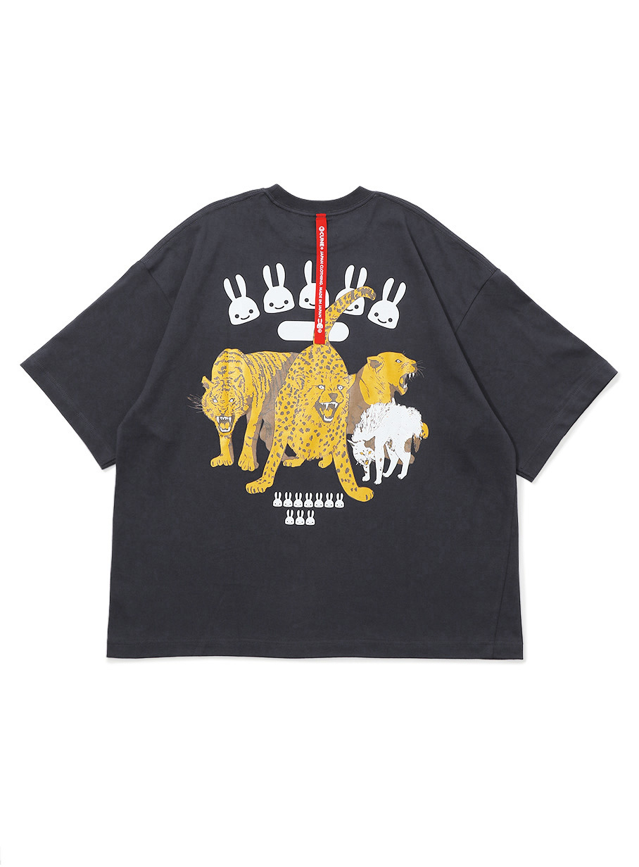 程よい柔らかさと厚みの生地を使用したビッグシルエットのTシャツ。後ろ首から肩にかけて配色のバインダー仕様になっています。古着でありそうなボディのねじれをパターンメイキングで表現しています。首の後にはテープが挟んでありアクセントになっていますが邪魔な場合は切ればいいと思います。取り外し可能なオリジナルネズミ型チャームが付いています。
