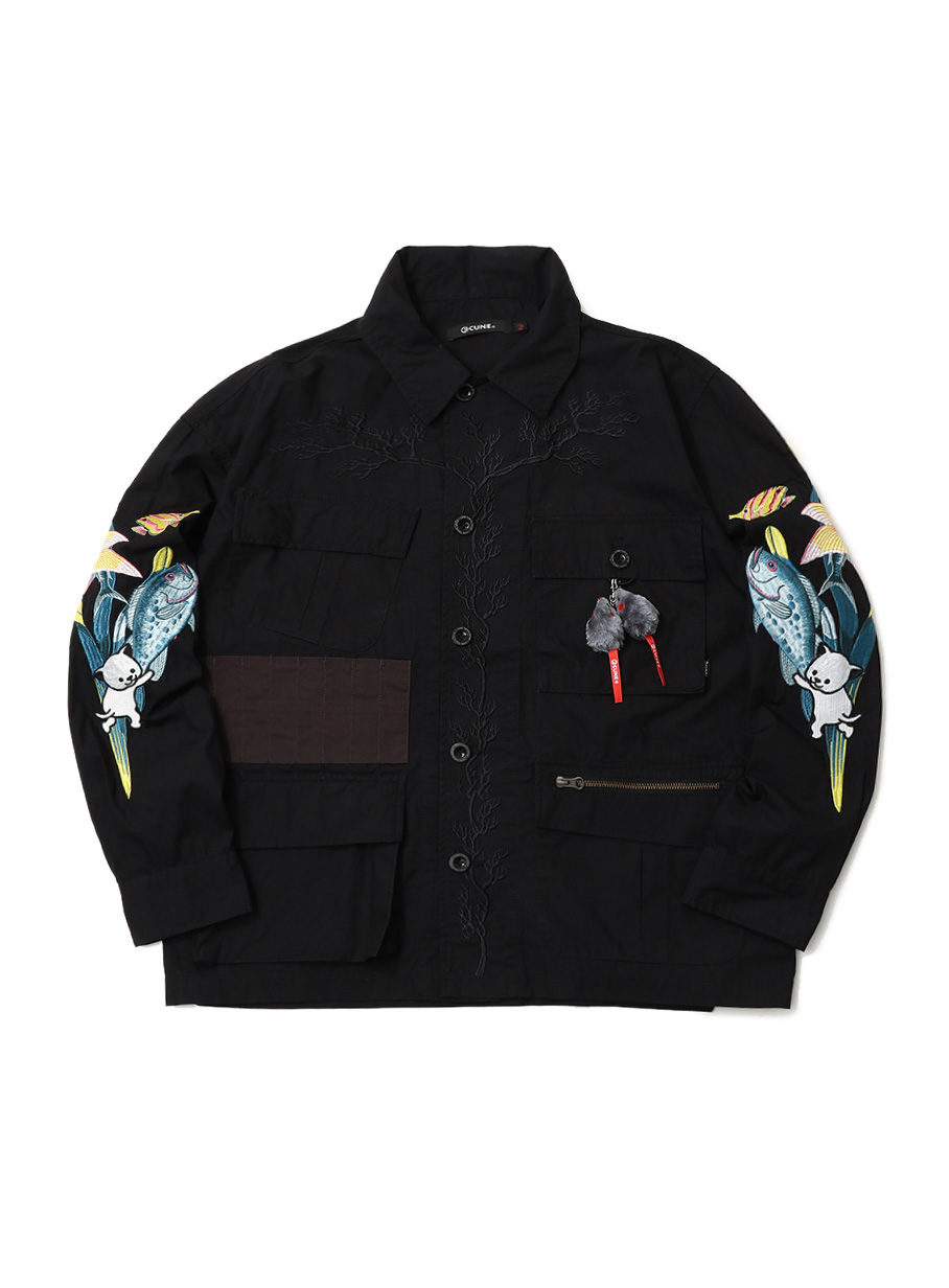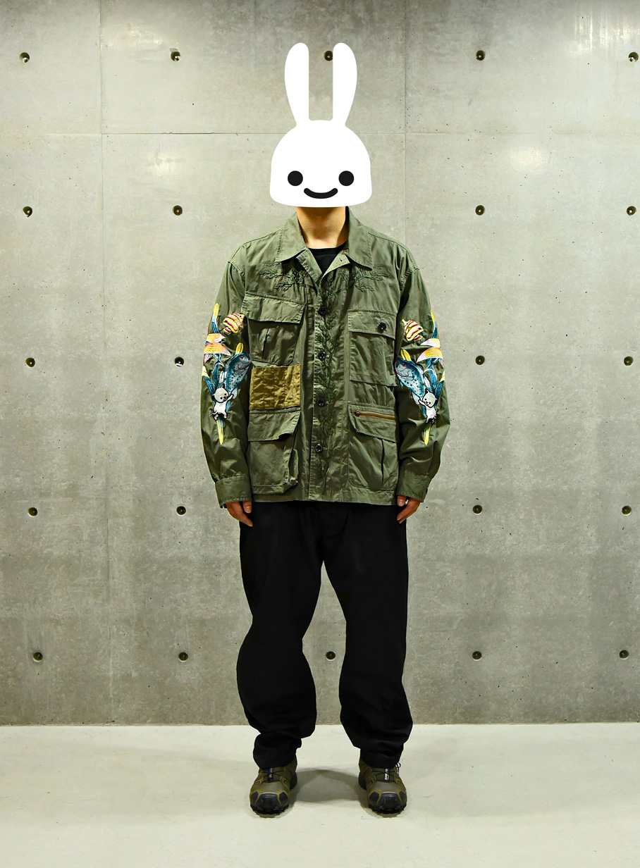 ミリタリー風のシャツジャケット。前たて、袖、背中には刺繍でグラフィックが入っています。右身頃には猫じゃらしが8本入れられるホルダーが付いています。取り外し可能なオリジナルネズミ型チャームが付いています。製品洗い加工を施しているため、パッカリングや、スレなどがあります。