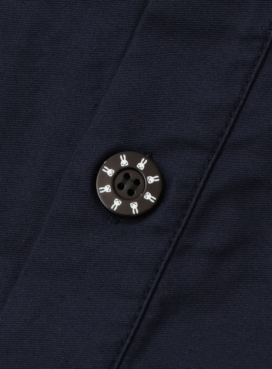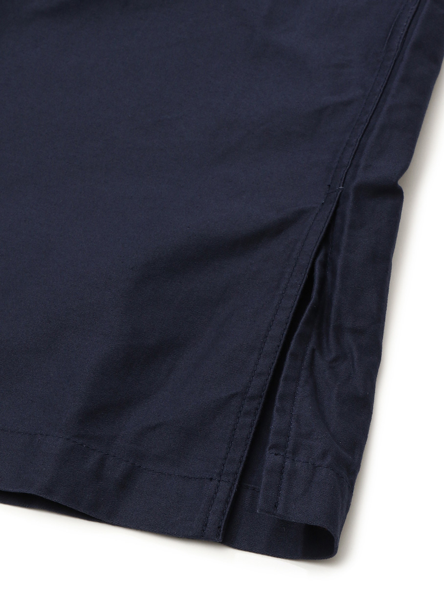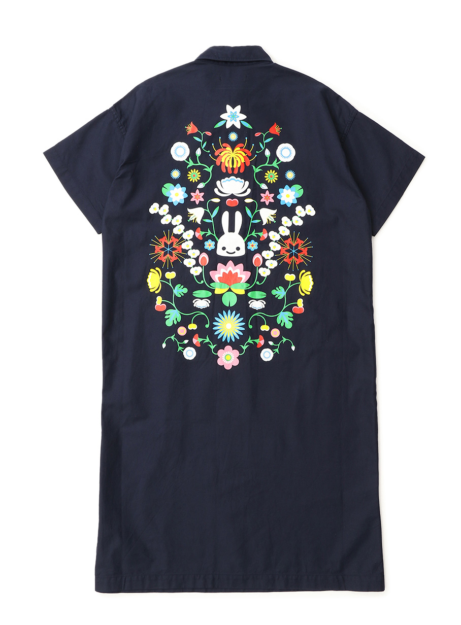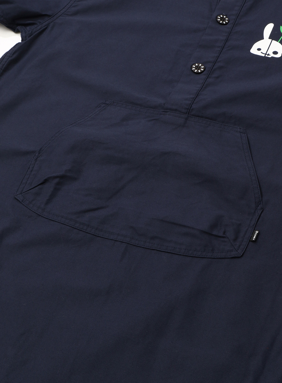 モールスキンを使用したシャツワンピース。プルオーバーでカンガルーポケットが付いています。ワイドでゆったり着られるシルエットになっています。製品洗い加工を施しているため、パッカリングや、プリントにスレなどがあります。