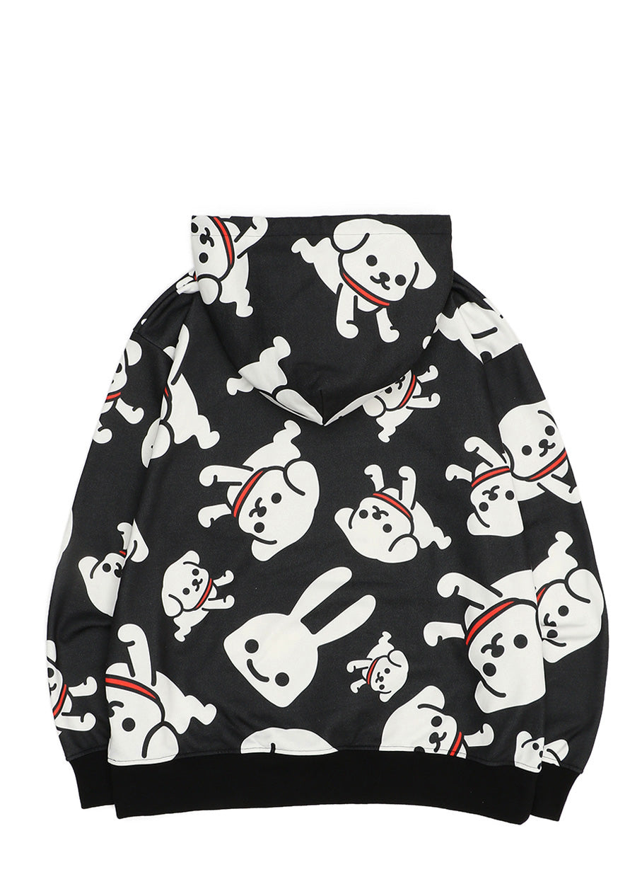 わんわん大好きキャンペーンを記念して作成したわんわん大きいパーカー。たくさんのわんわんの中、ウサギがまぎれています。