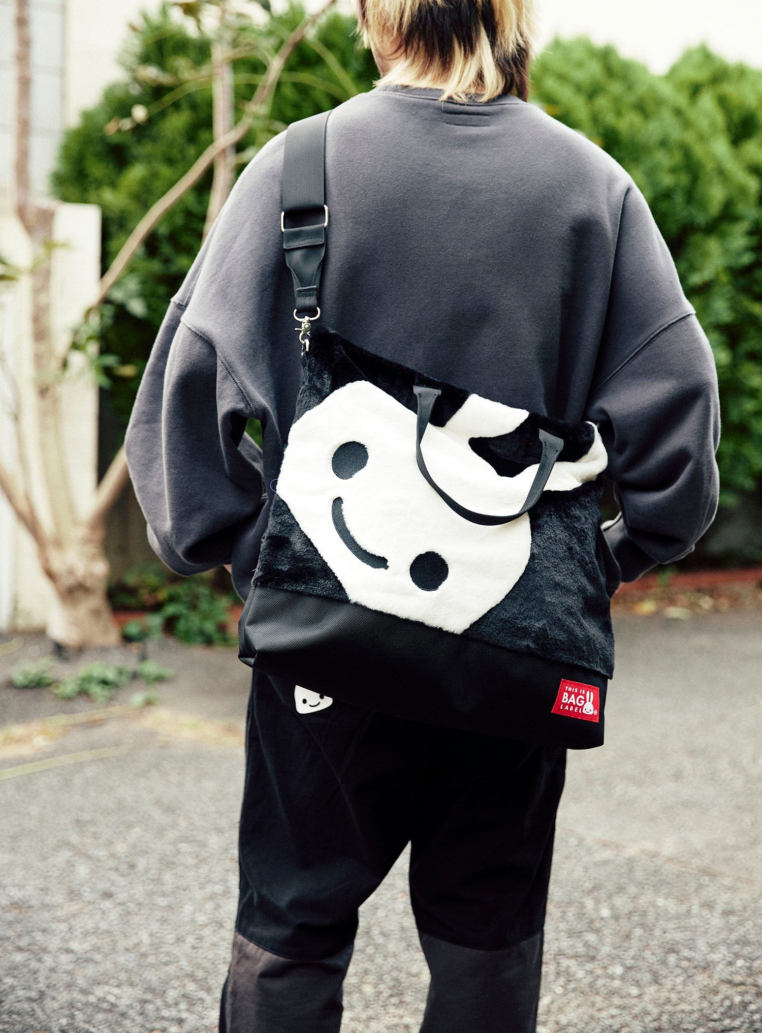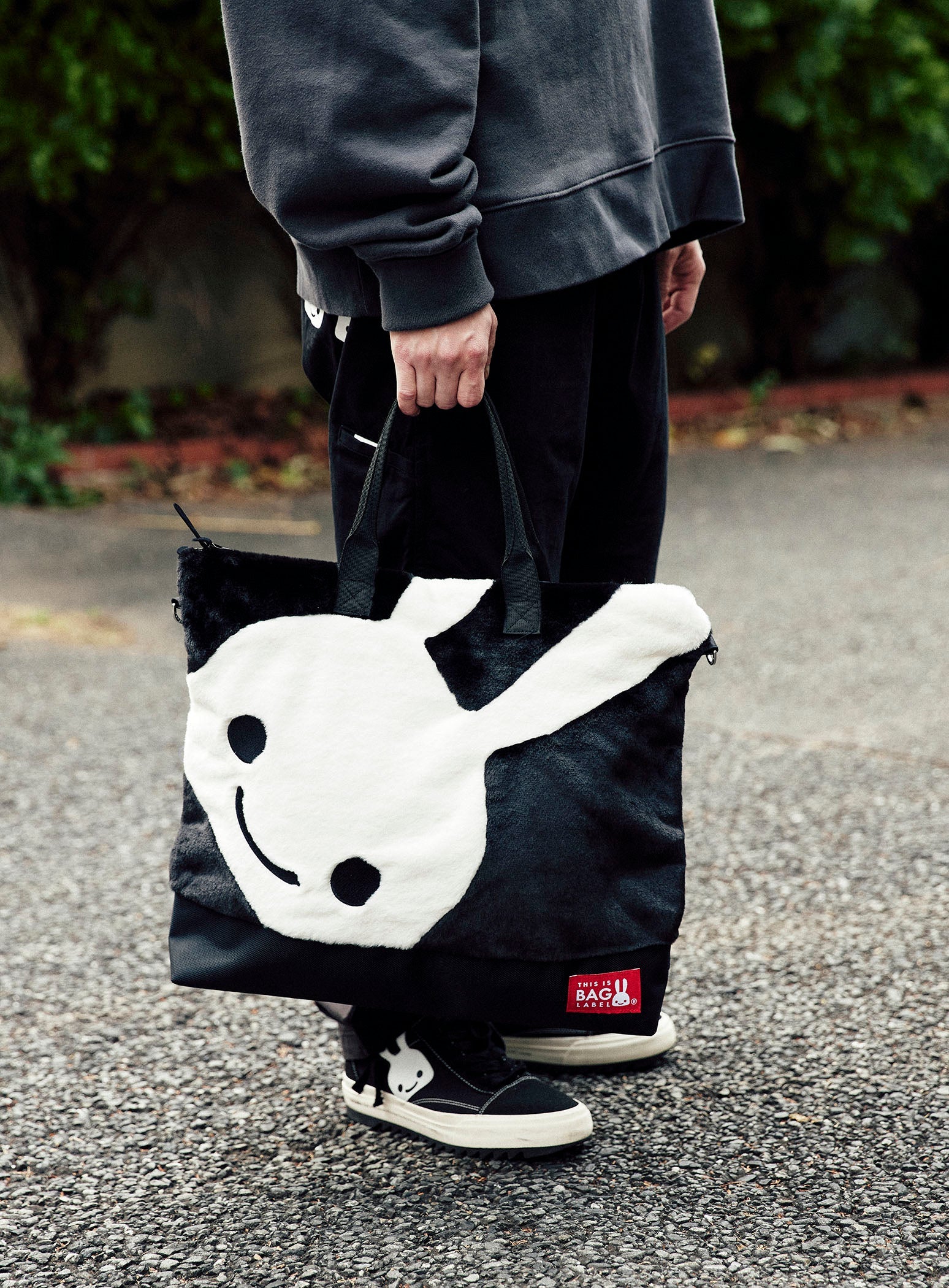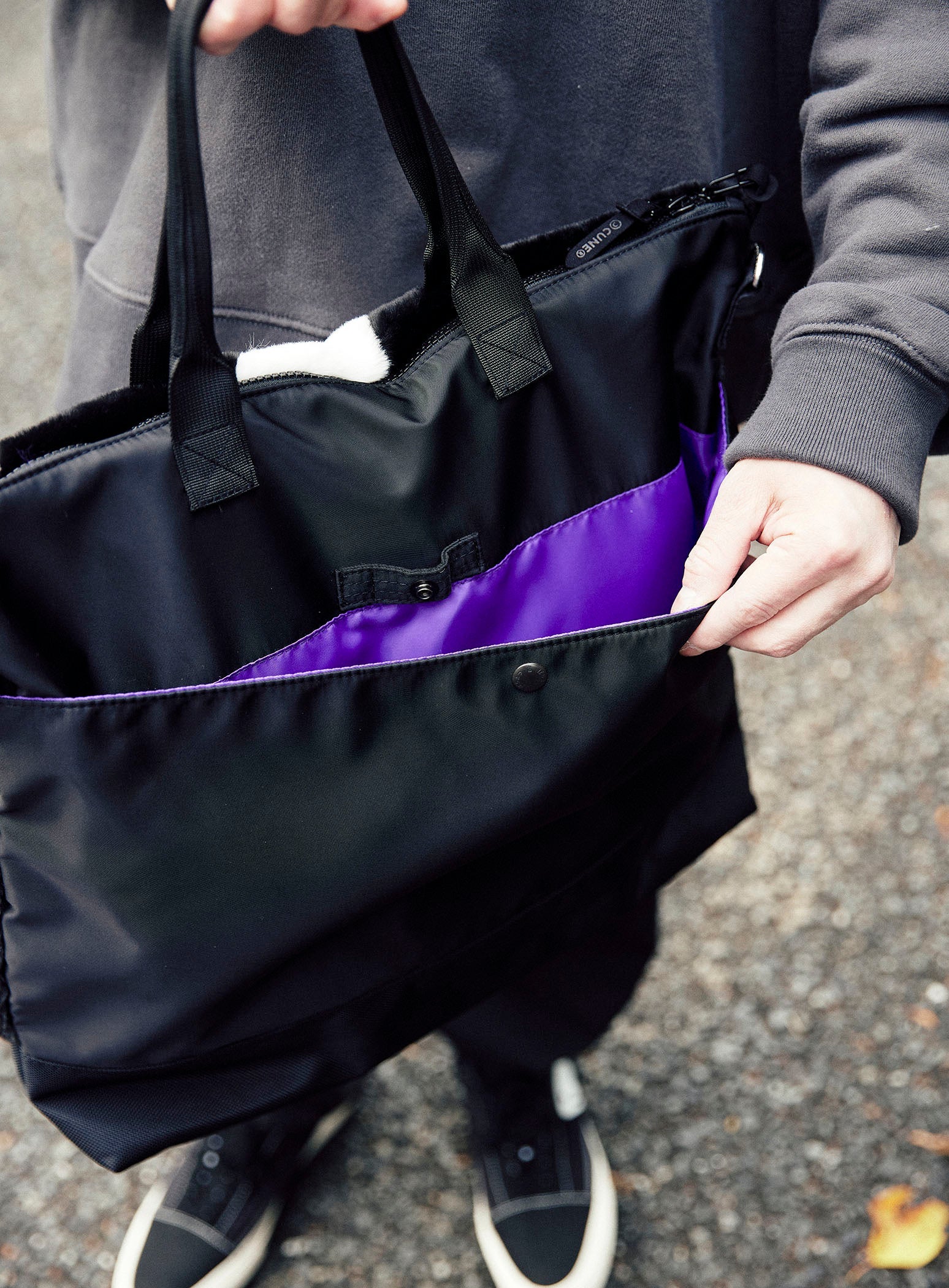 ファー素材のトートバッグ。ショルダーと手持ちの2wayで使用できます。両開き可能なジップの引っ張りにはCUNEロゴが入っています。バックにスナップボタン付きの収納があります。背面内側にCSS(CUNE SOUND SYSTEM)を搭載したふらしポケットが付いています。CSSは縫い込まれているので取り出すことができません。反対側には2箇所内ポケットがあります。
