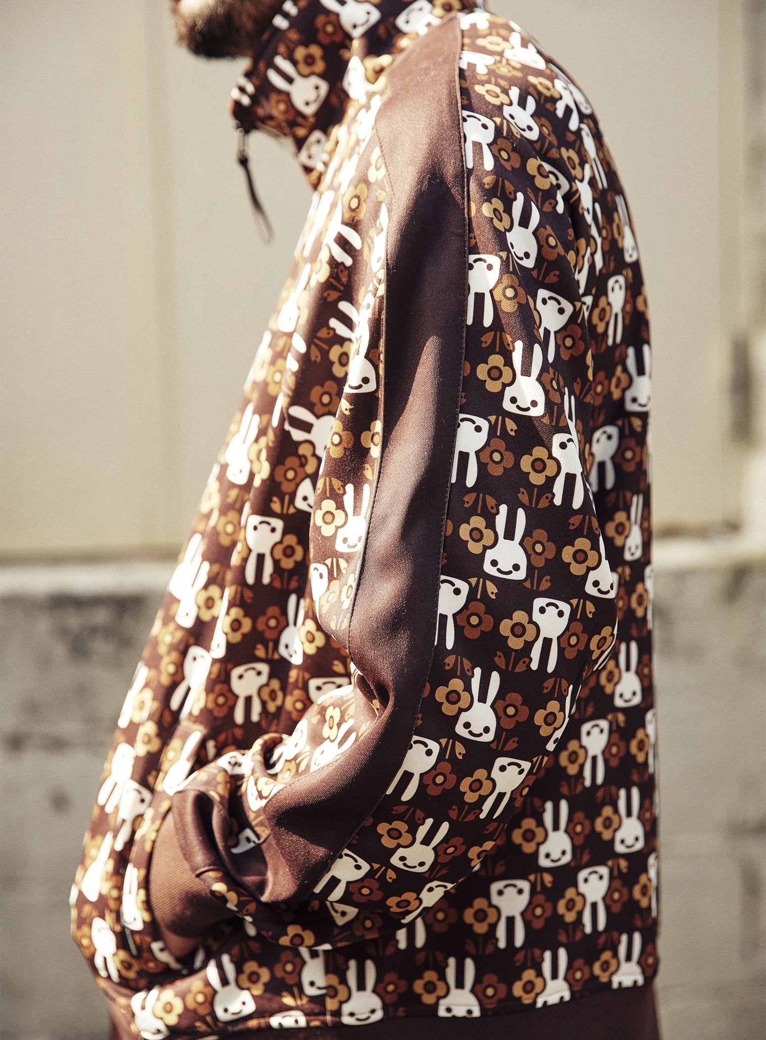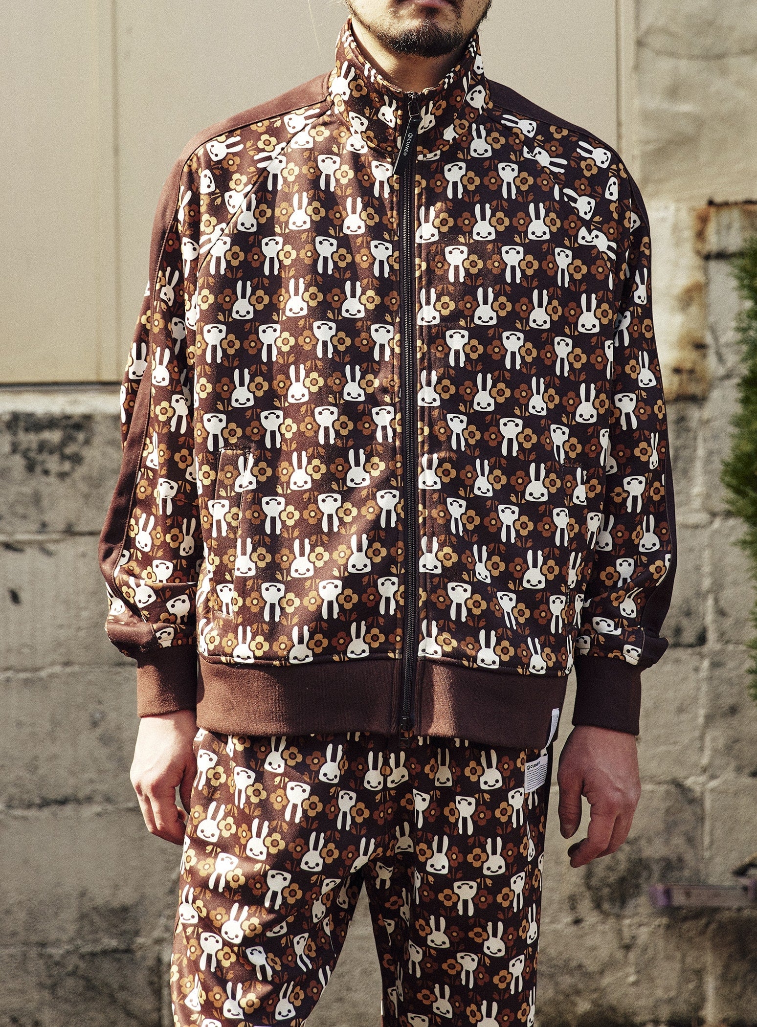 発色の良いオリジナル総柄プリントが施されたトラックジャケット。ラグランスリーブで肘とお腹付近にはあまり意味のなさそうなダーツを入れています。前あきのファスナーはダブルジップ仕様になっておりオリジナルの引き手が付いています。