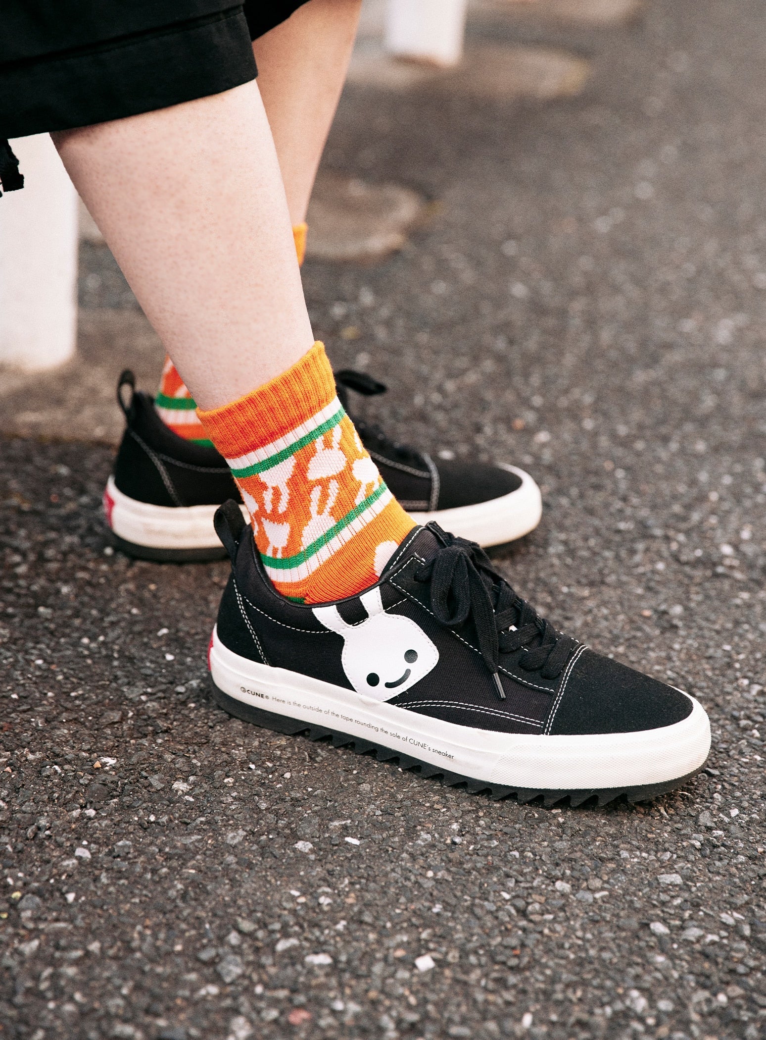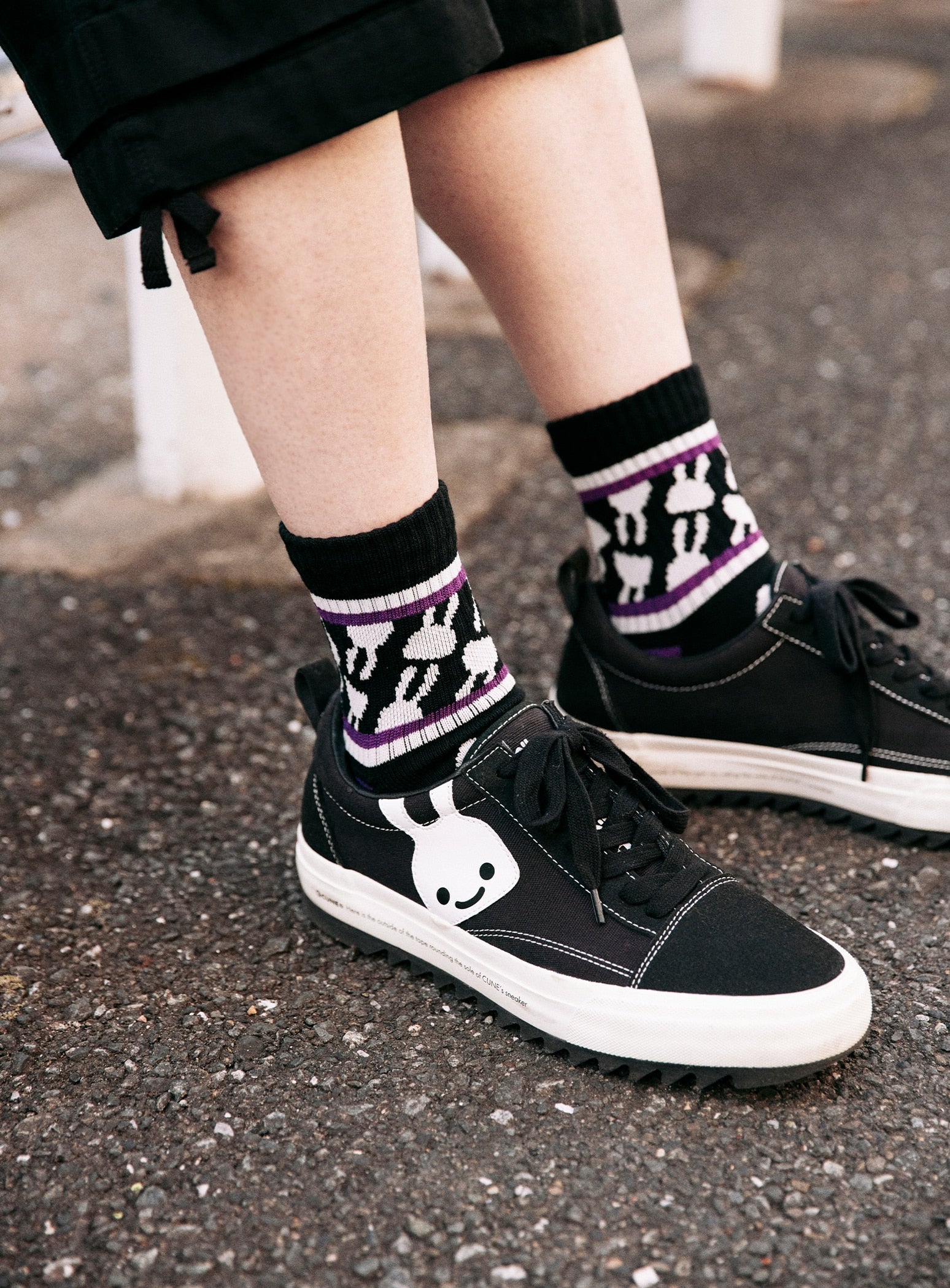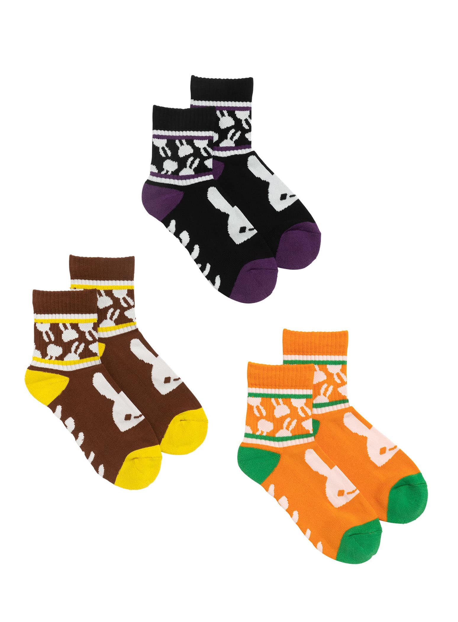 ライン入りのショートソックス。履き口を折り返した部分に「わたしはここをおりかえしました」と書いてあり、足の裏部分には「アシノウラ」と書いてあります。サイズは24cm〜27cmくらいの大きさです。