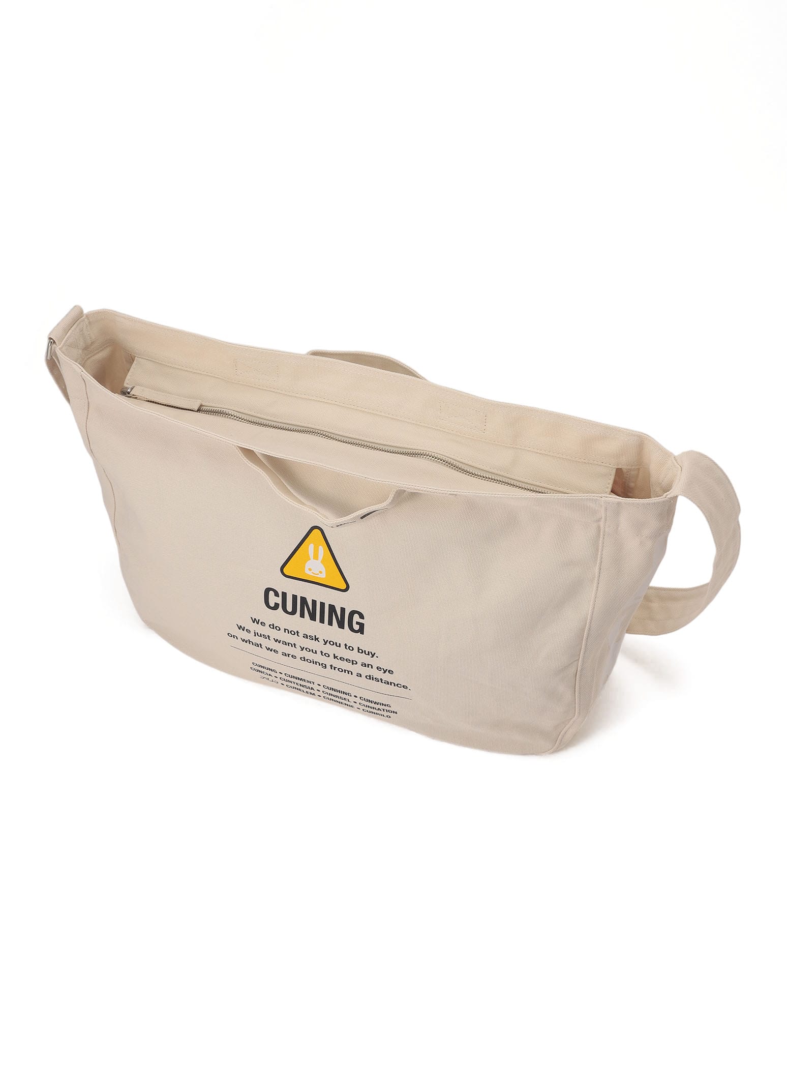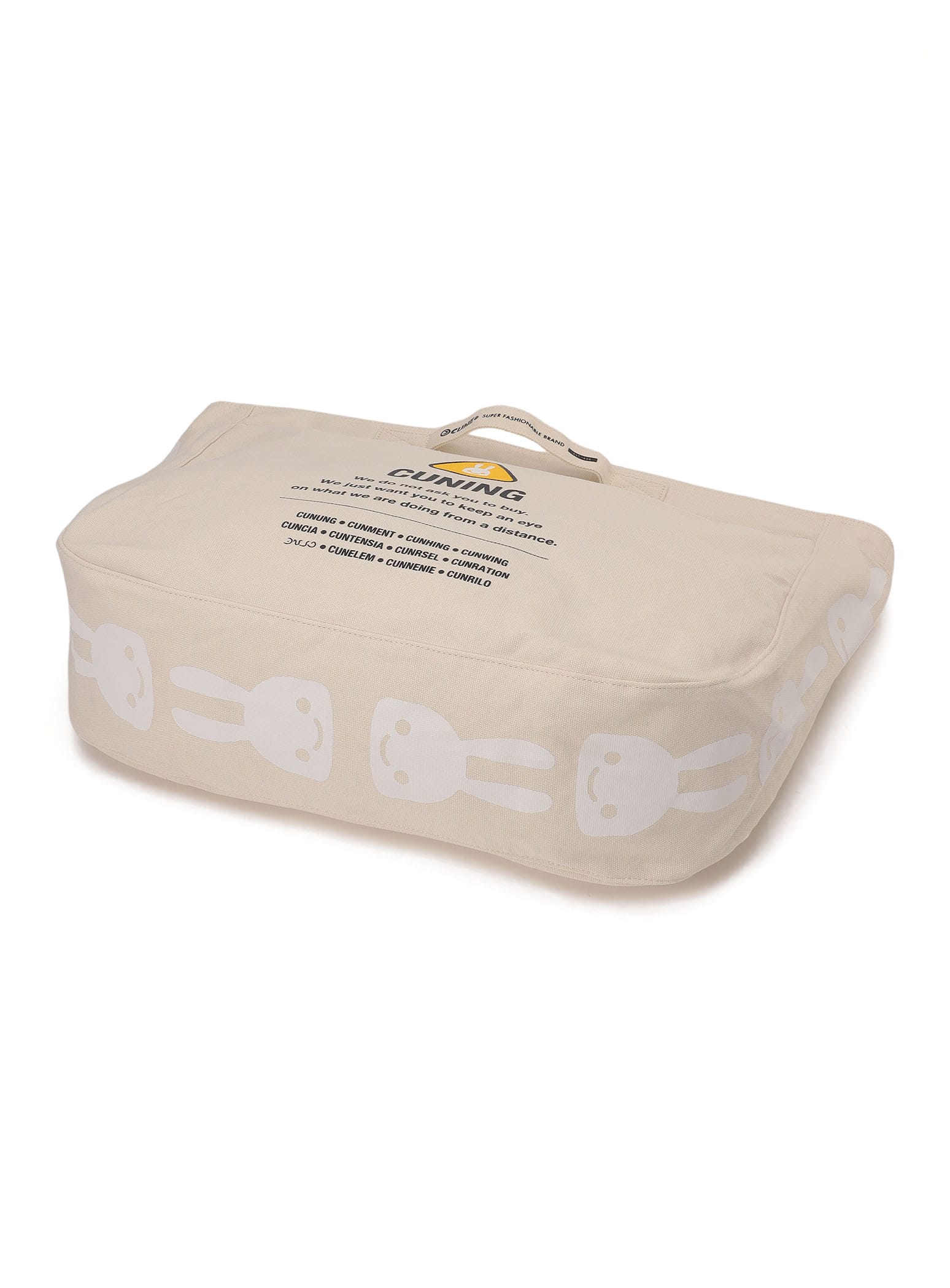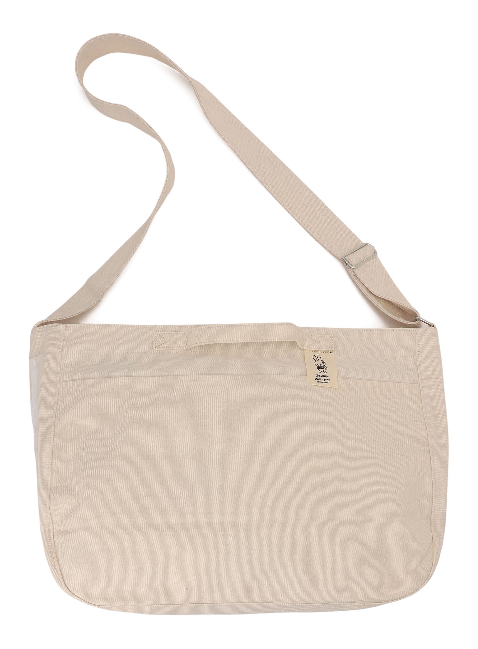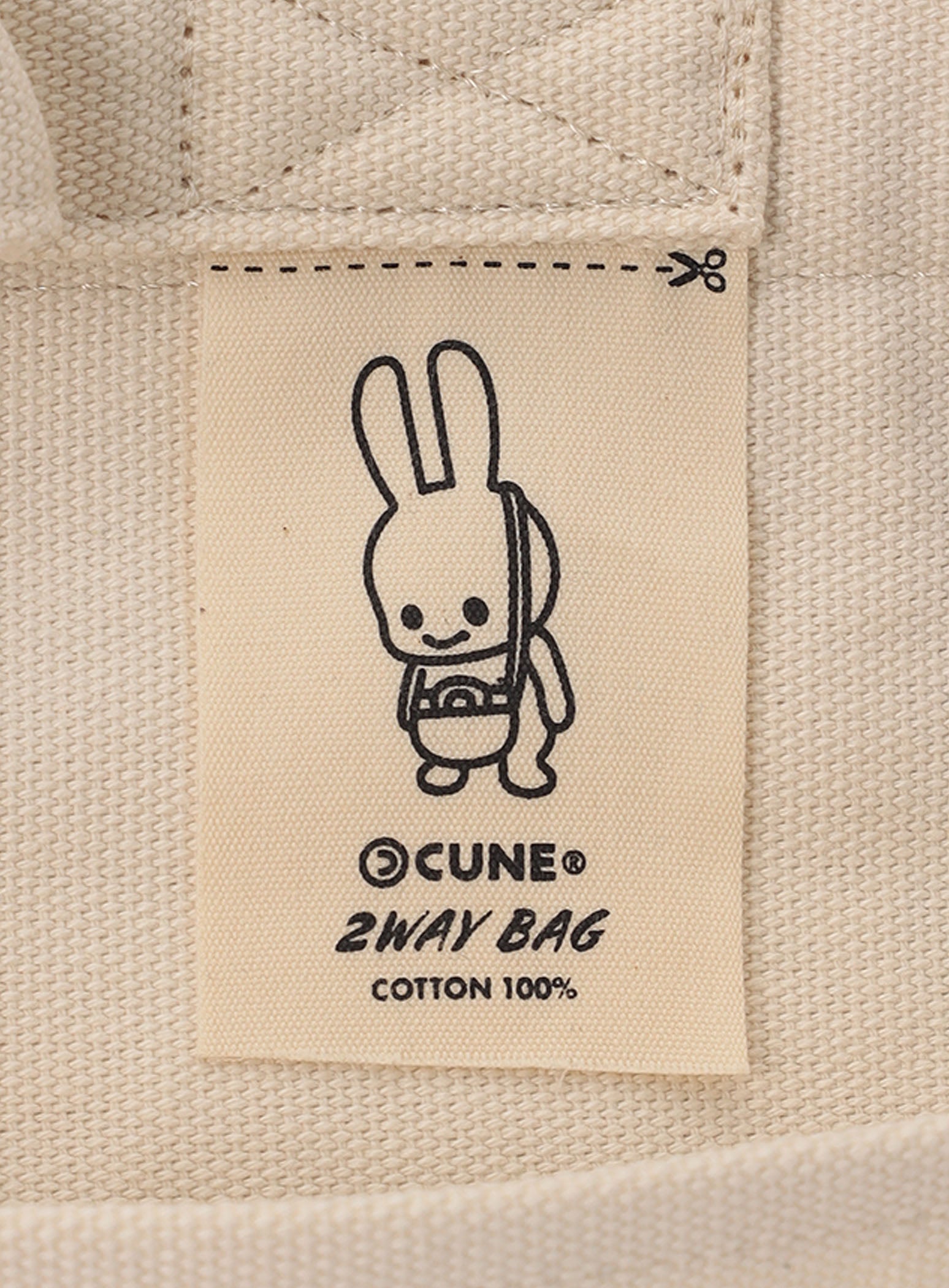 帆布の2wayバッグ。マチの部分にウサギがプリントされています。持ち手部分にはプリントとネームが付いています。内部にはポケットが付いています。底面にはバッグが語りかけているようなプリントがされています。