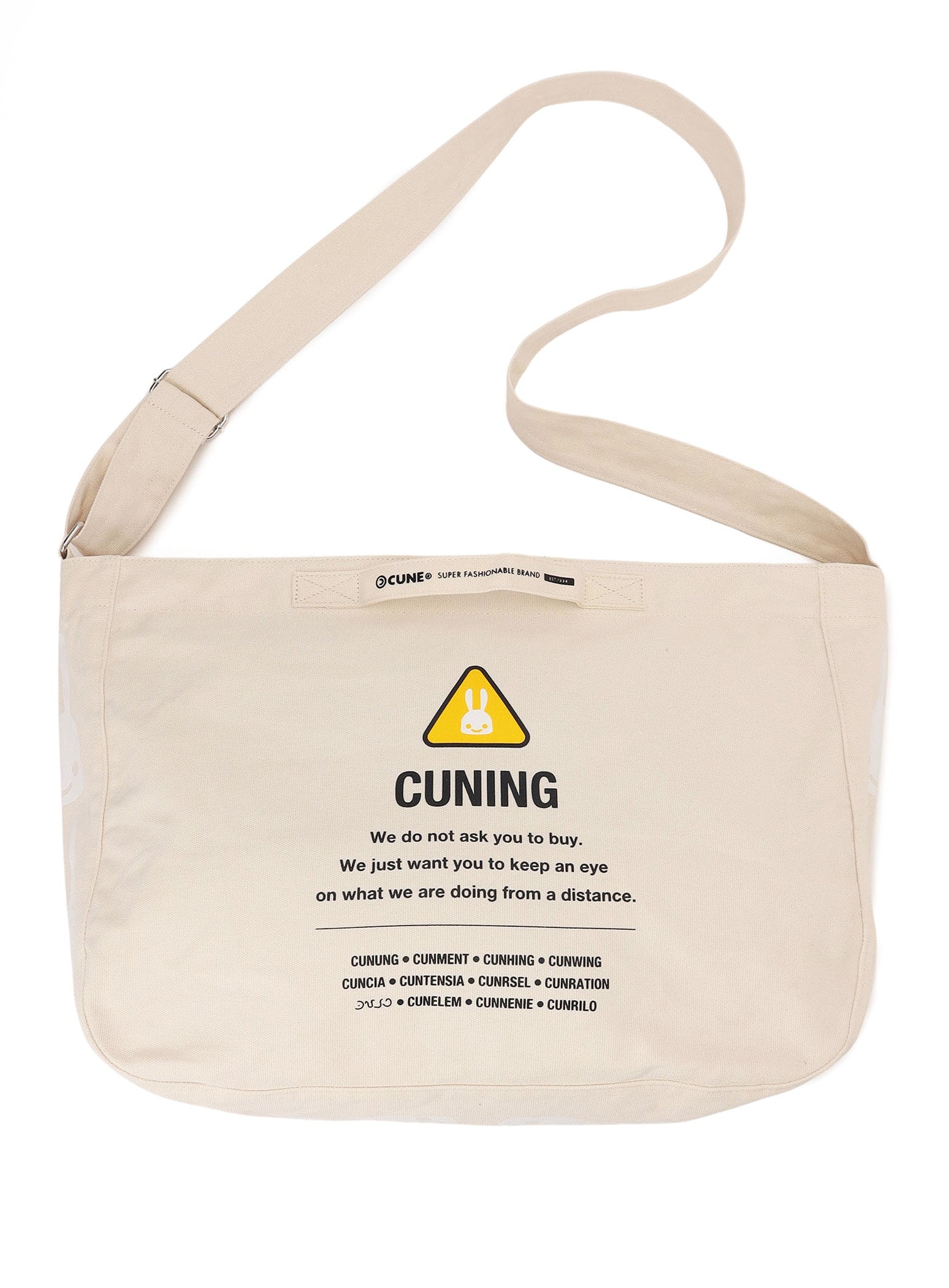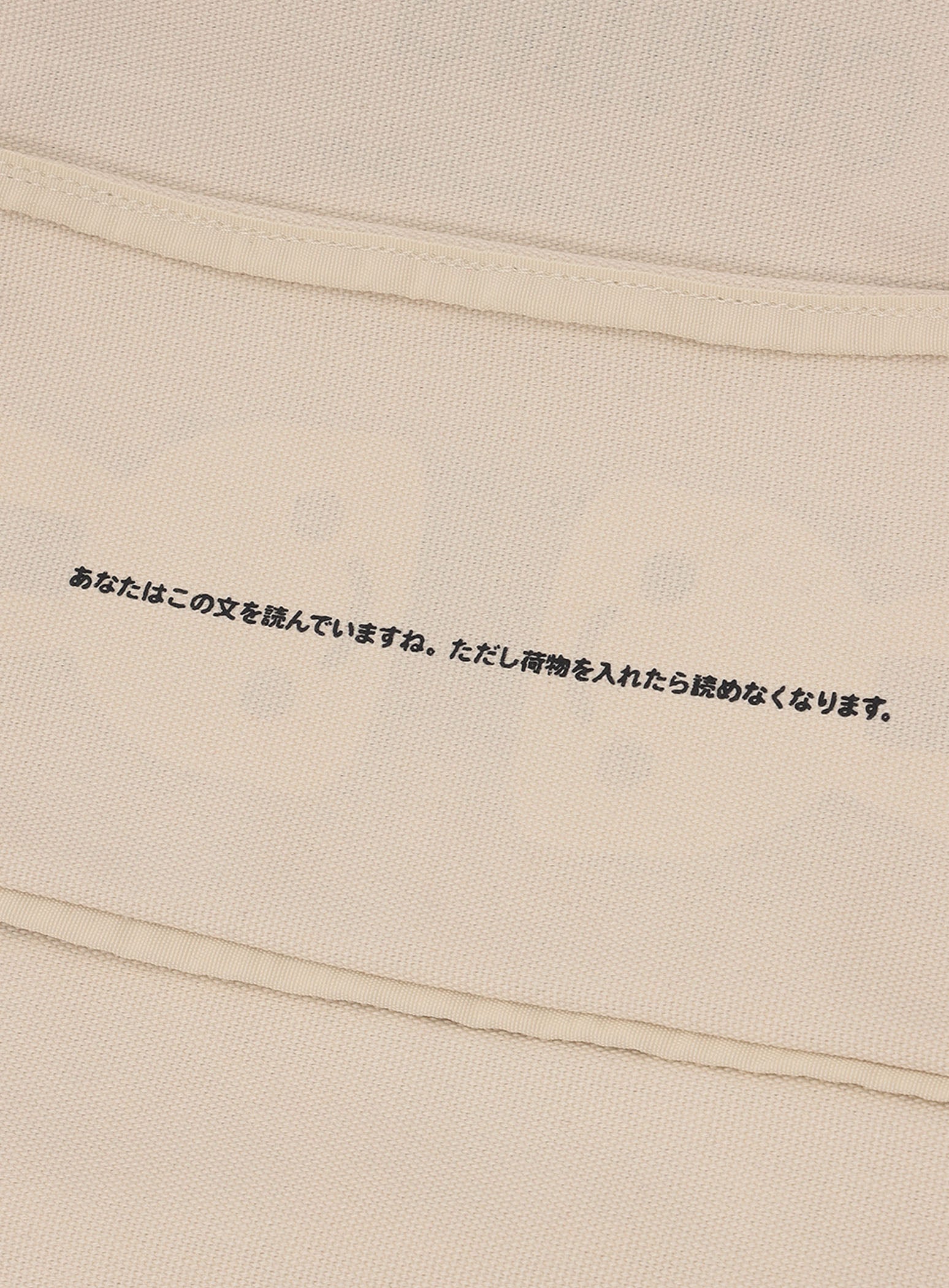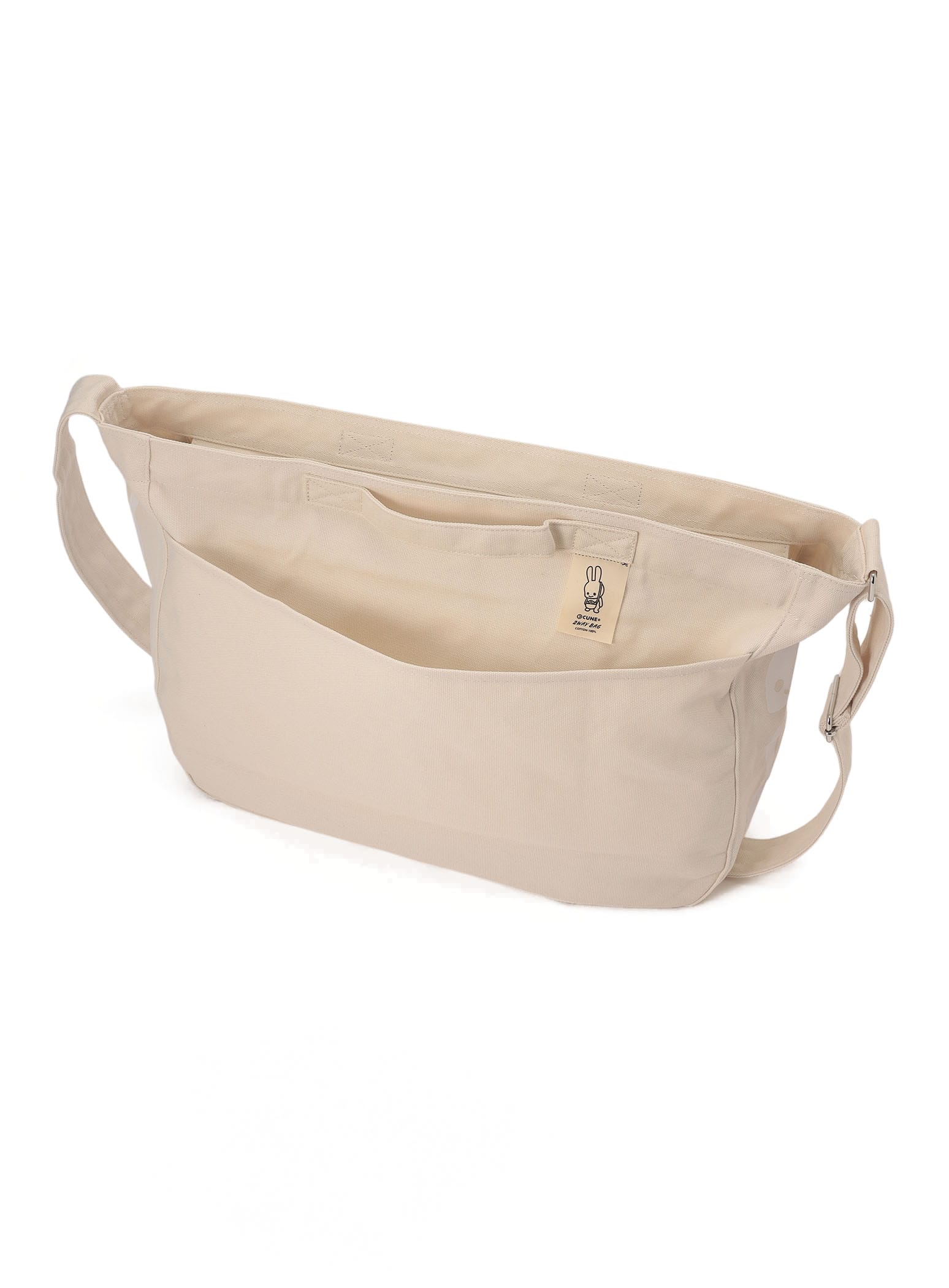 帆布の2wayバッグ。マチの部分にウサギがプリントされています。持ち手部分にはプリントとネームが付いています。内部にはポケットが付いています。底面にはバッグが語りかけているようなプリントがされています。