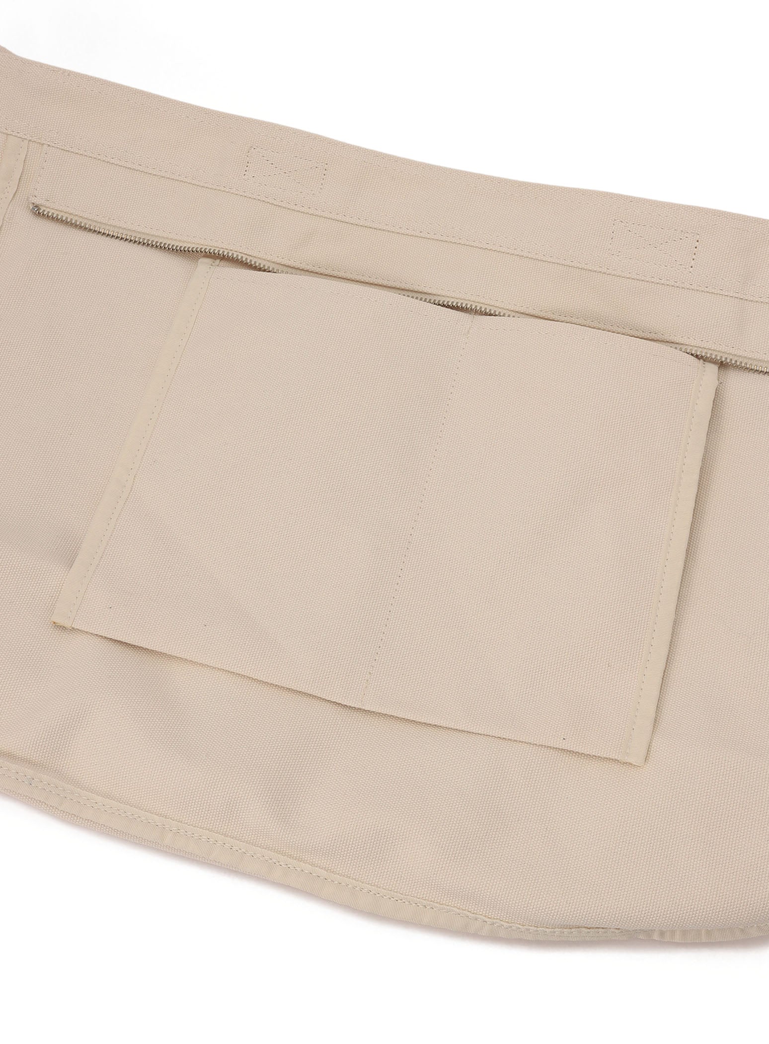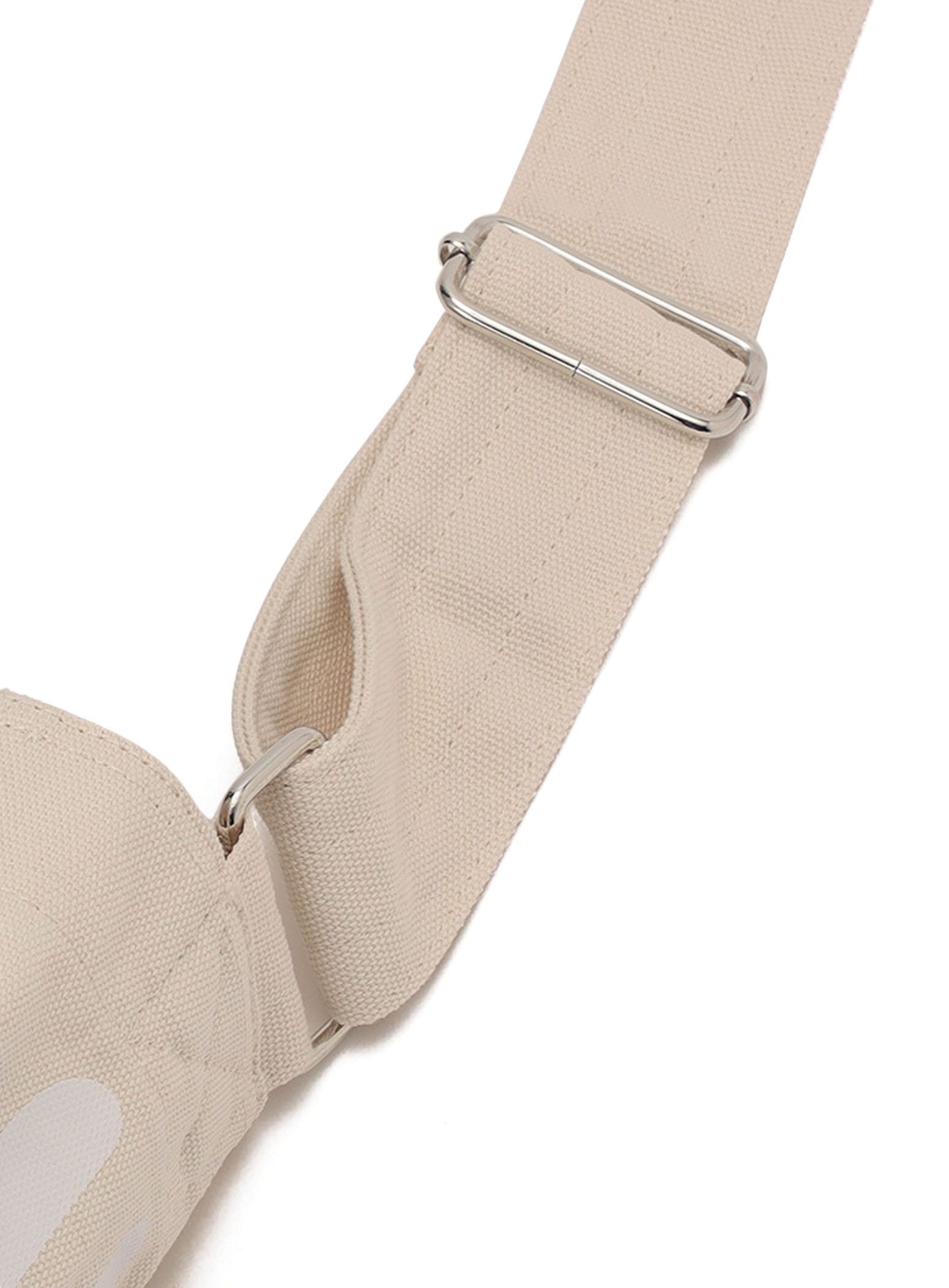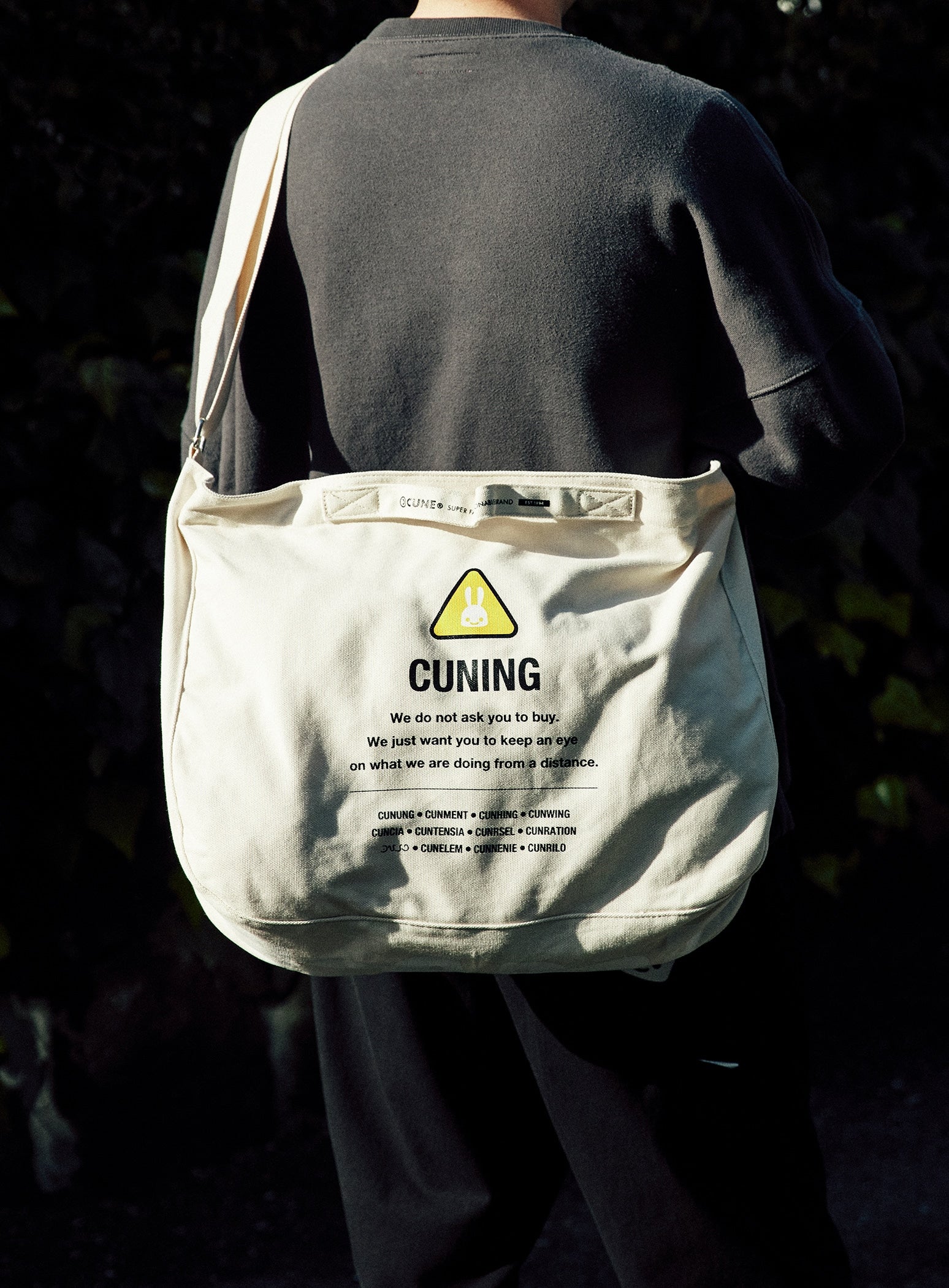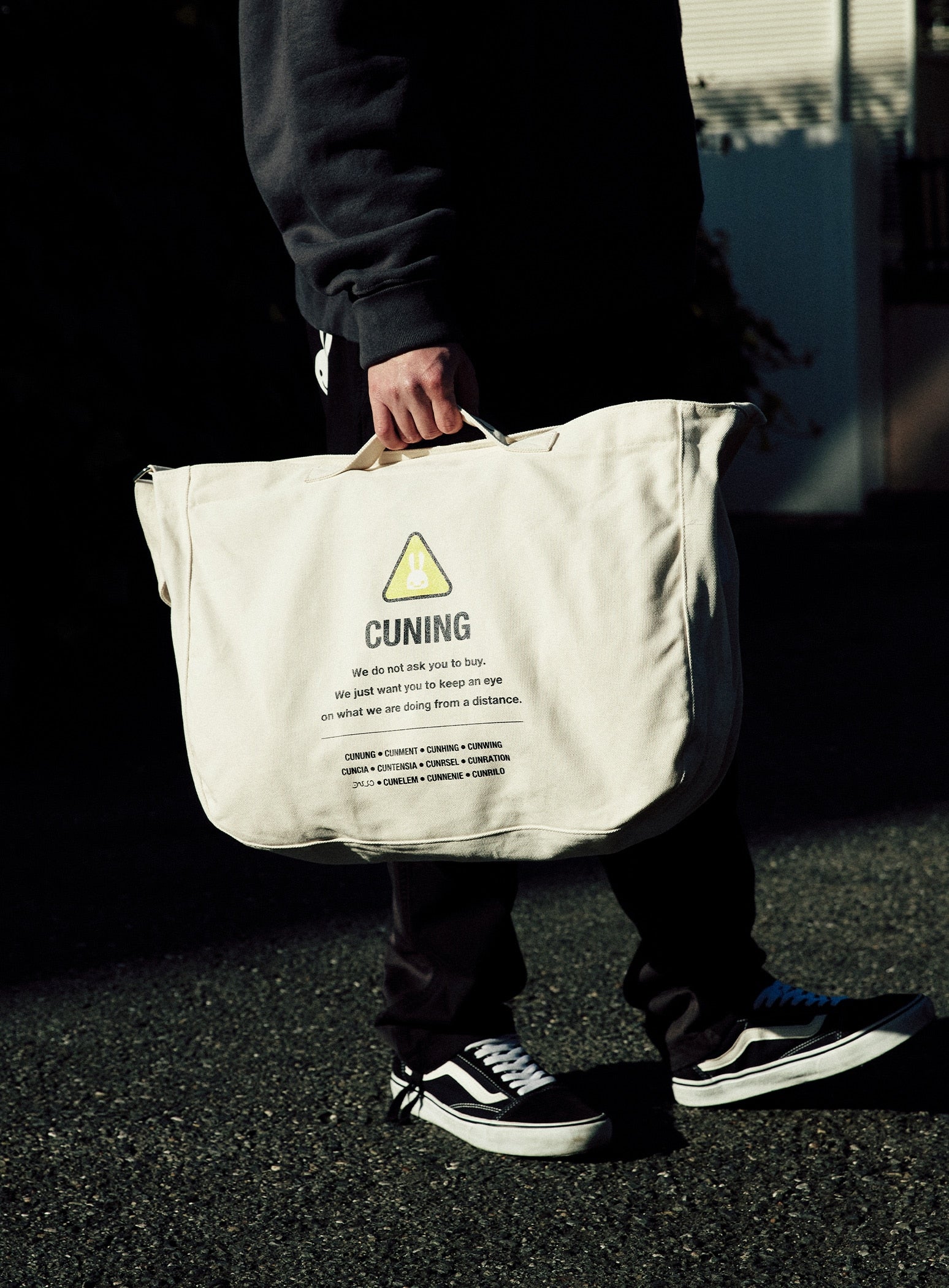 帆布の2wayバッグ。マチの部分にウサギがプリントされています。持ち手部分にはプリントとネームが付いています。内部にはポケットが付いています。底面にはバッグが語りかけているようなプリントがされています。