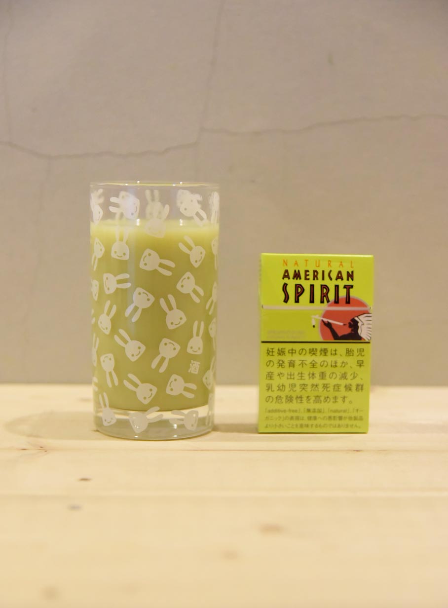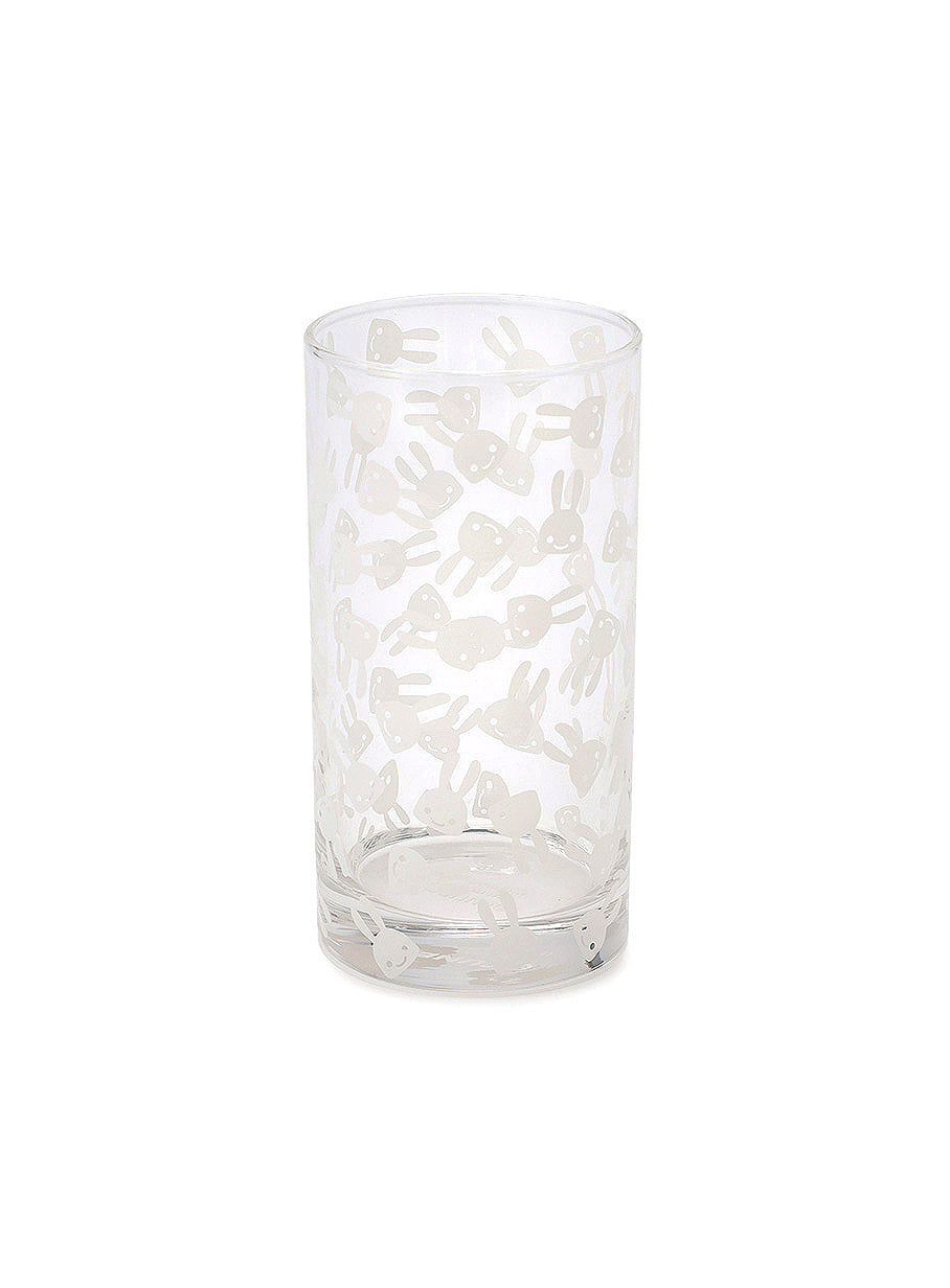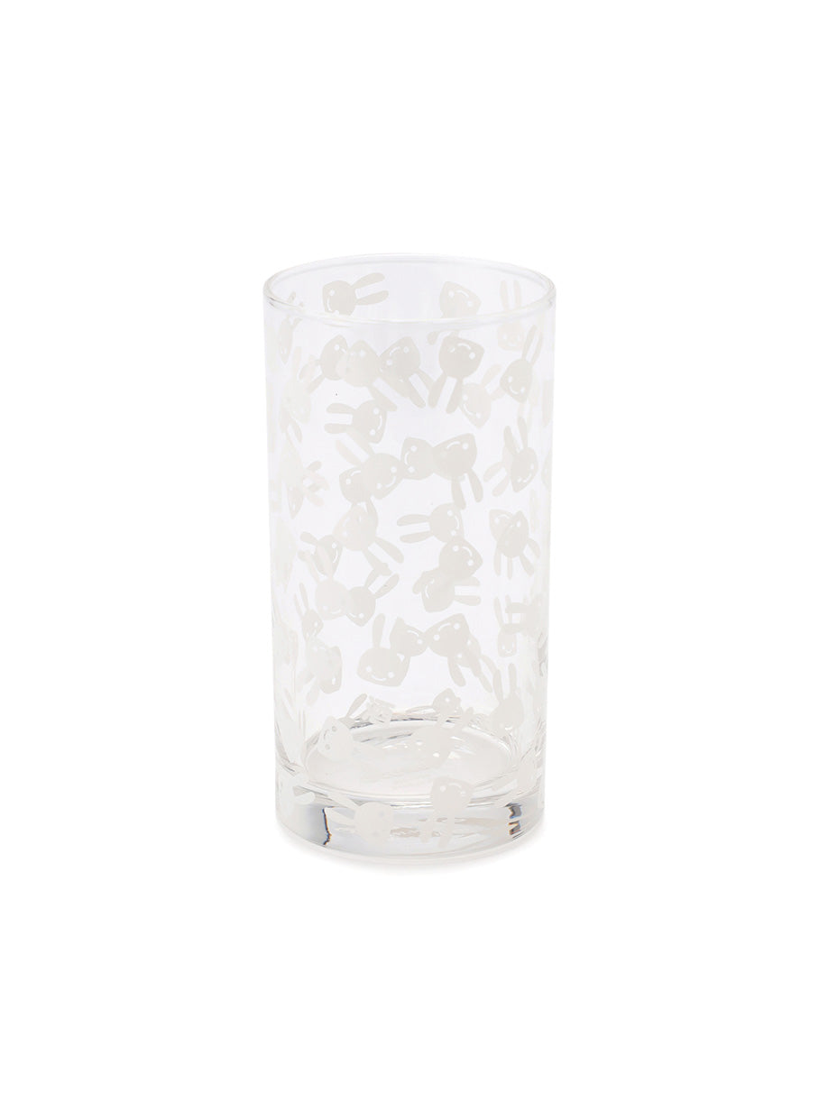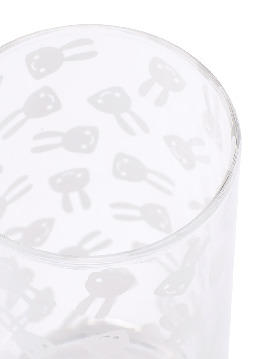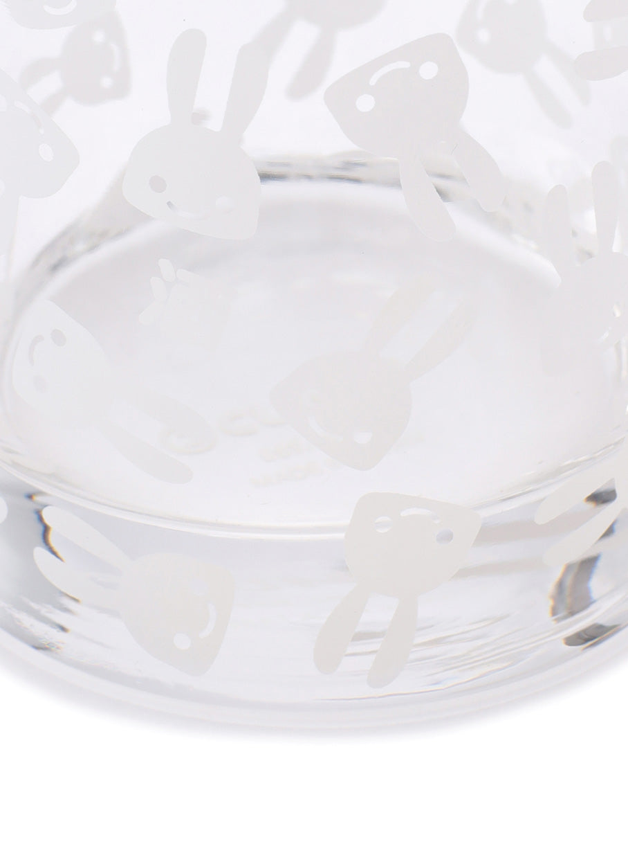 うさぎがたくさんプリントされた水割り用グラス。ウサギの隙間に酒という文字が隠れています。