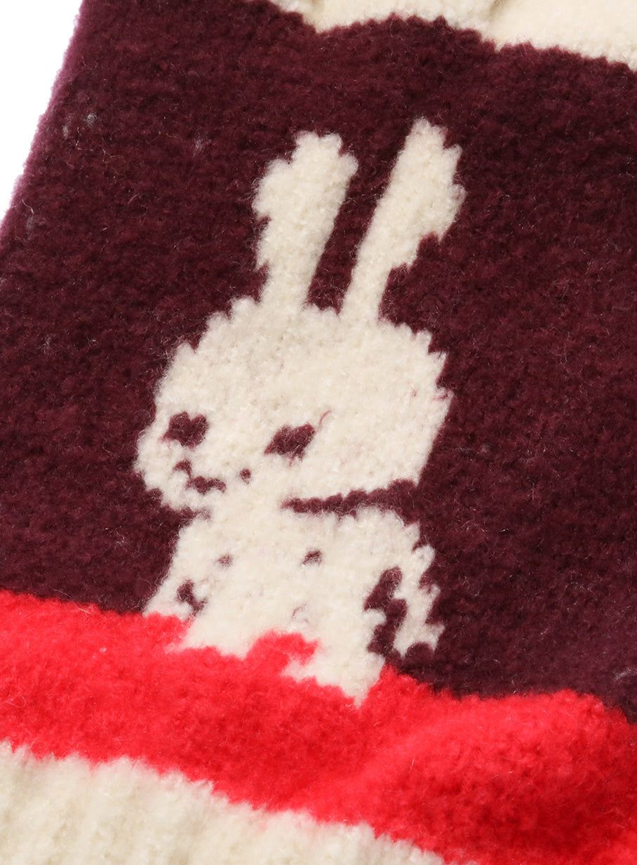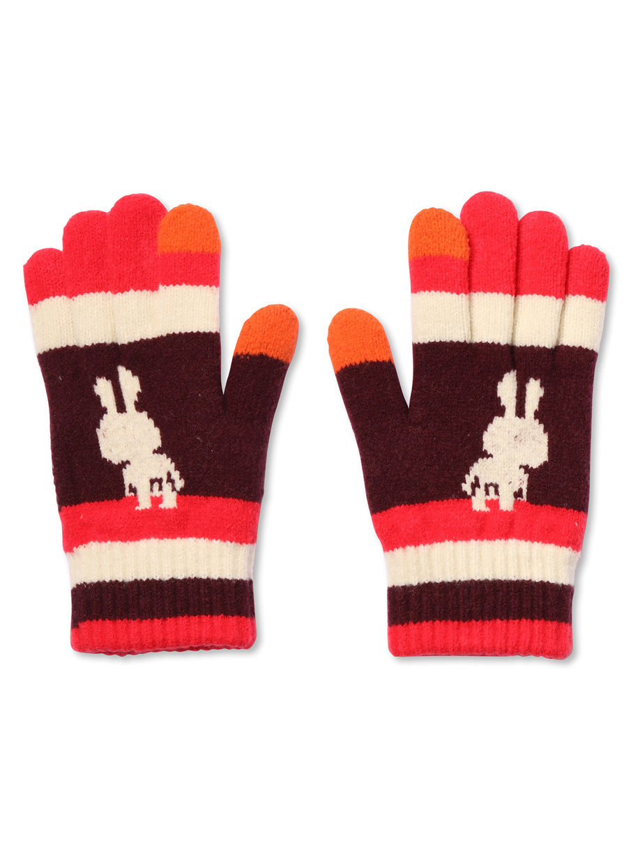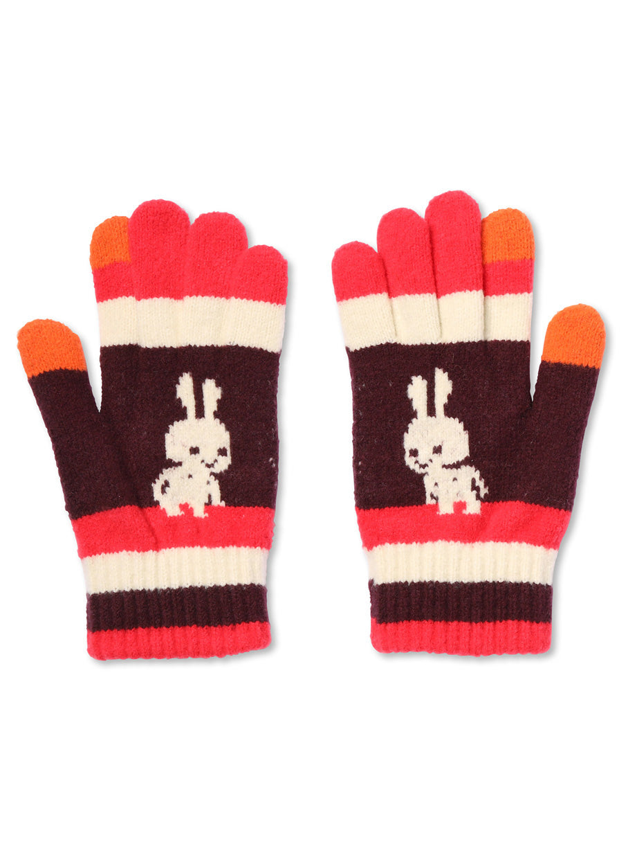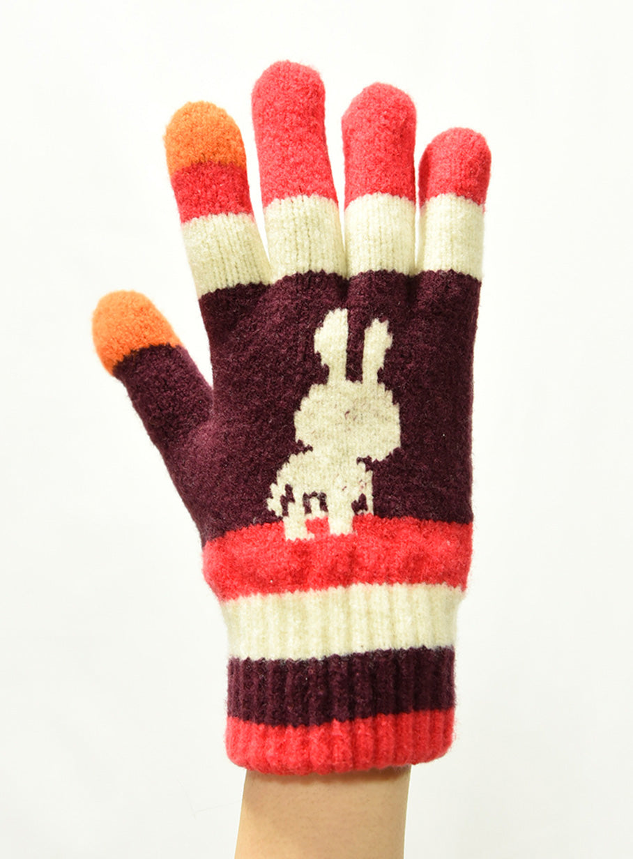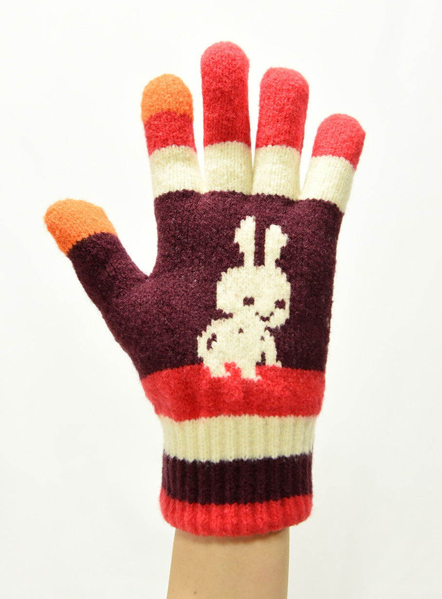 首が前に出たうさちゃん柄の手袋。親指と人差し指はスマートフォン対応です。起毛加工を施した糸を使用しているため、肌触りがよく冷気を通しにくいです。