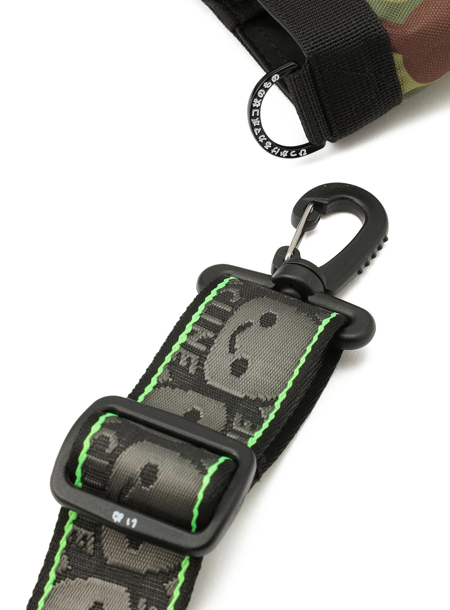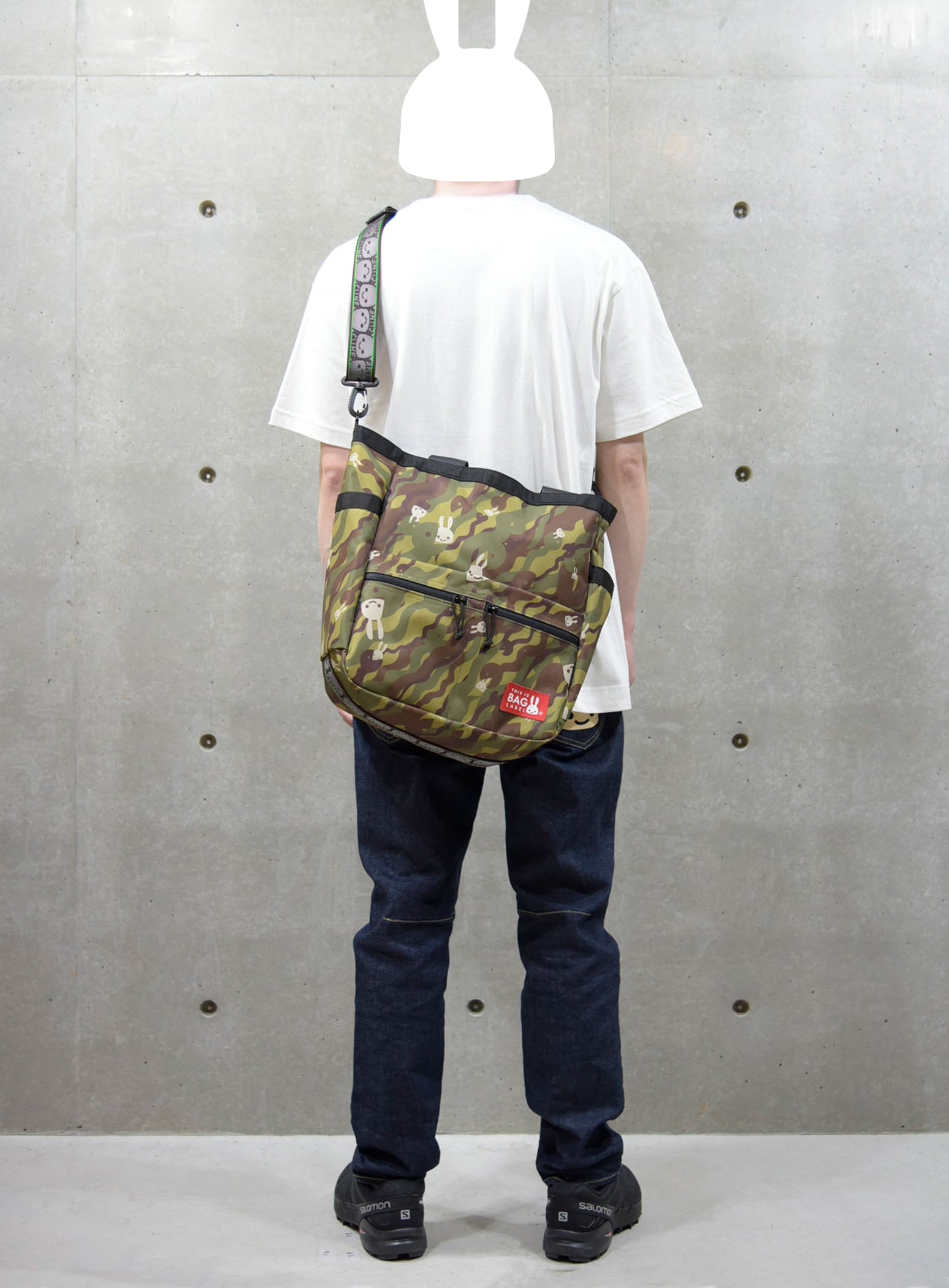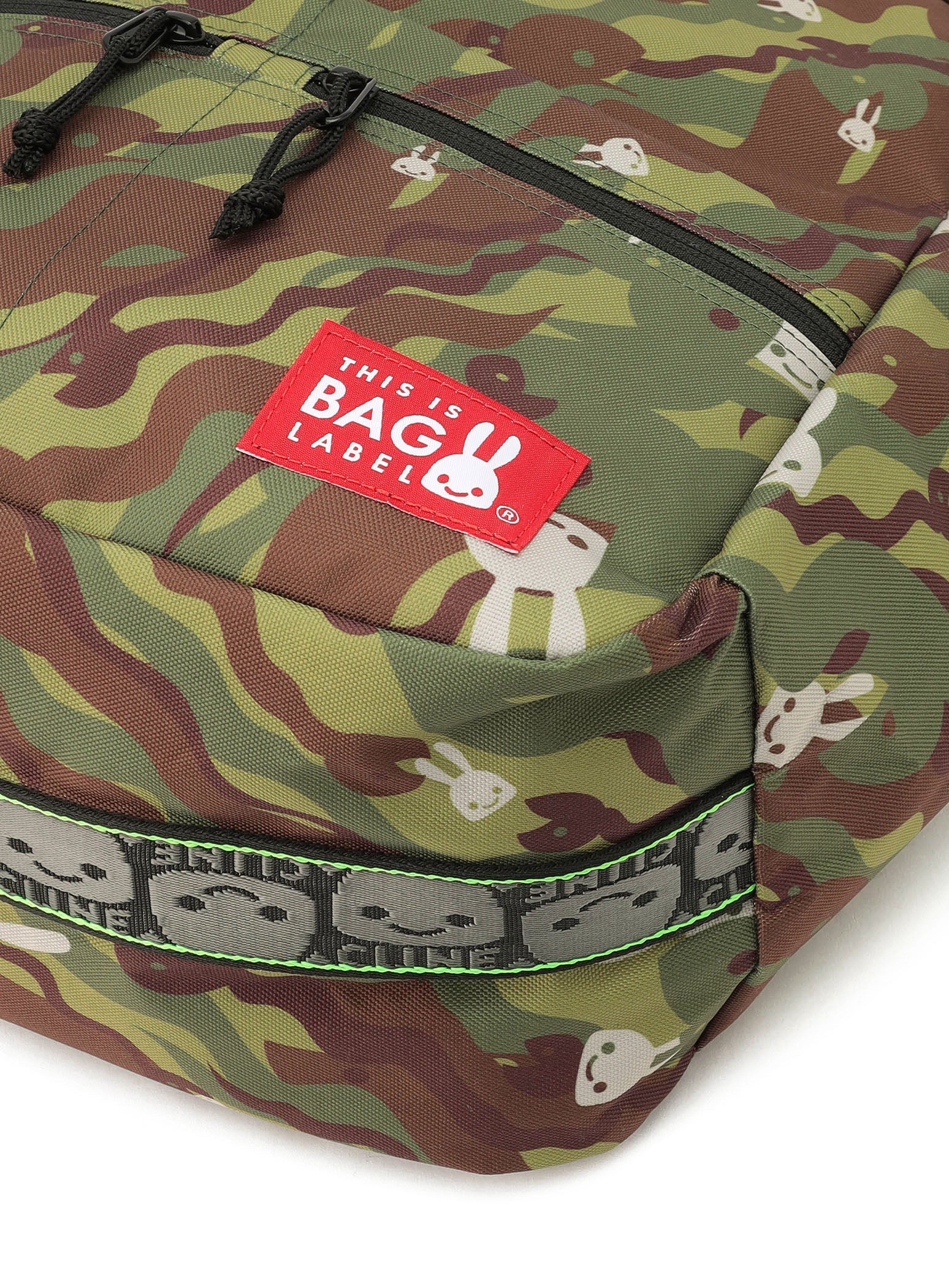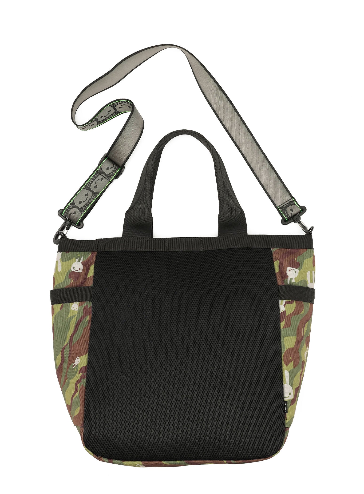 へび迷彩柄のトートバッグ。取り外し可能なショルダーがついているので2WAYで使用できます。メインコンパートメントの背面側にはバックルで取り外し可能なDカンがついていて、CSS(CUNE SOUND SYSTEM)を搭載しています。CSSは縫い込まれているので取り出すことができません。表側はスナップ付きの収納とジップ付きの収納が1つの仕様です。両サイドにポケットがあり、500mlのペットボトルが余裕をもって収まるサイズ感です。