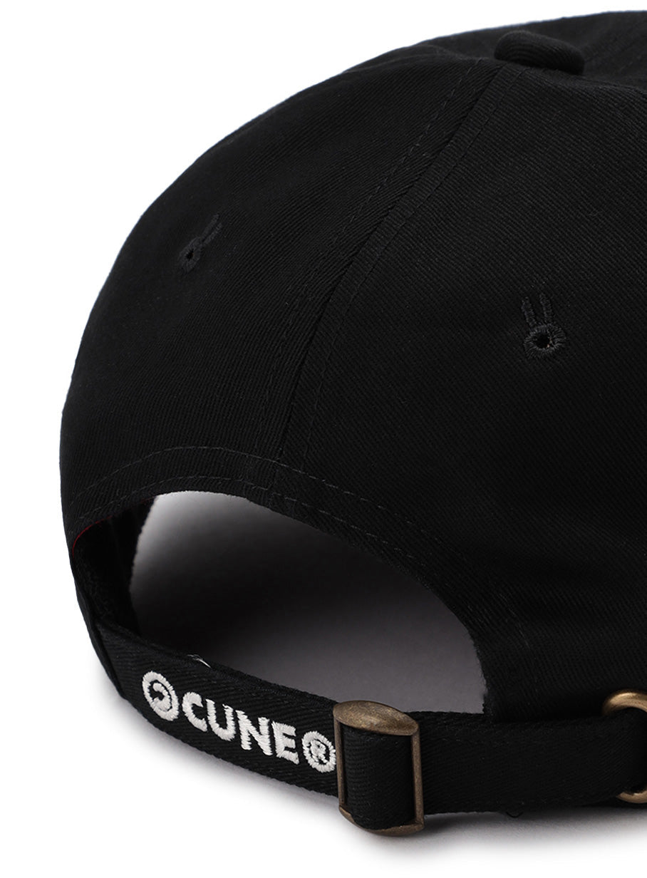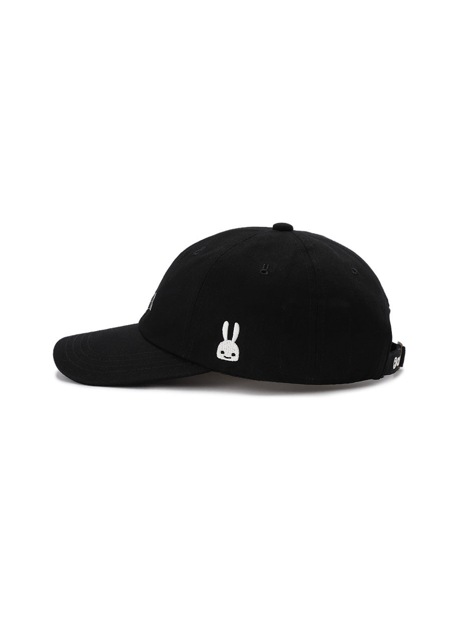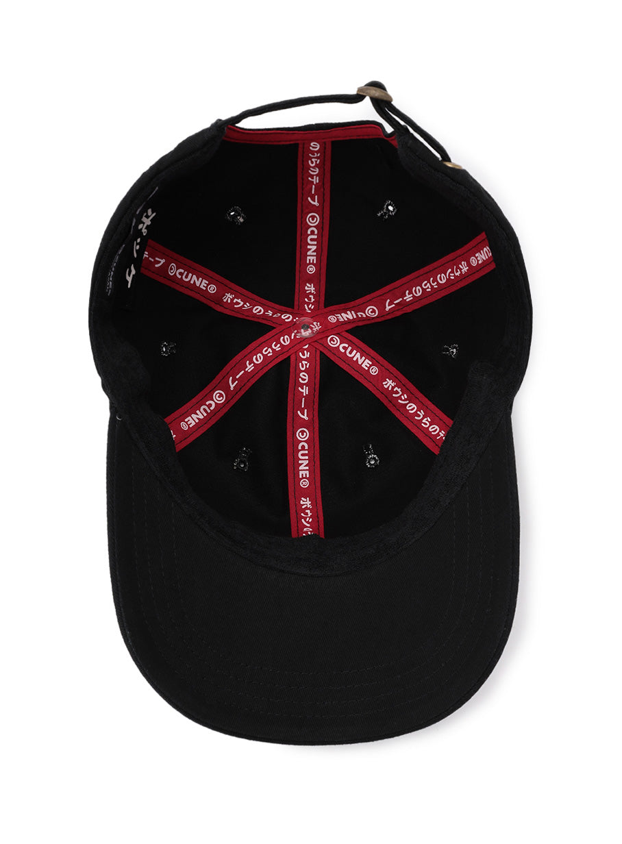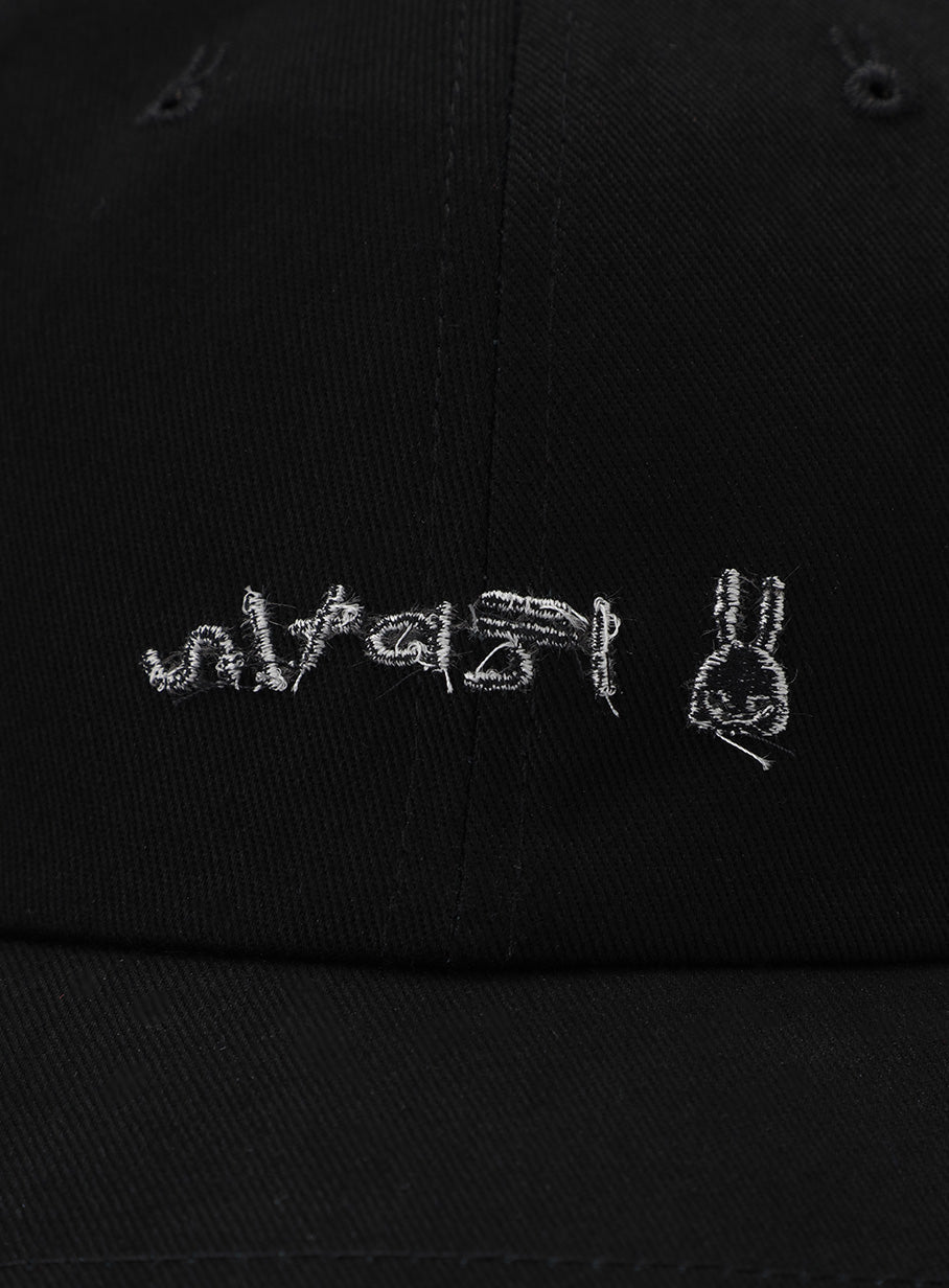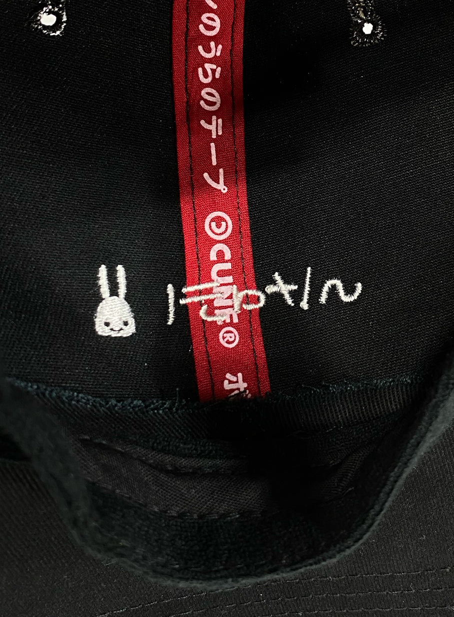 フロント、左脇、アジャスター部分に刺繍を施した隠しポケット付きの6Pキャップ。フロント刺繍はあえて裏表が反転されたデザインになっています。テープには「ボウシのうらのテープ」とプリントされています。帽子上部にはウサギの形の菊穴が配置されています。アジャスターがついているので男女ともに合わせやすいです。