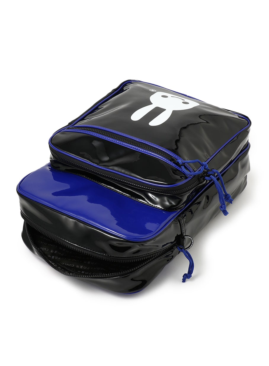 エナメル素材のショルダーバッグL。メインコンパートメントは仕切りが一つのシンプルな構造です。全てのジップに紐が付いているため開け閉めしやすいです。