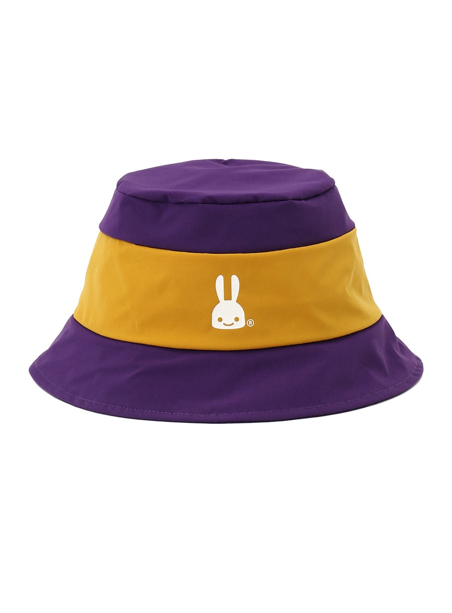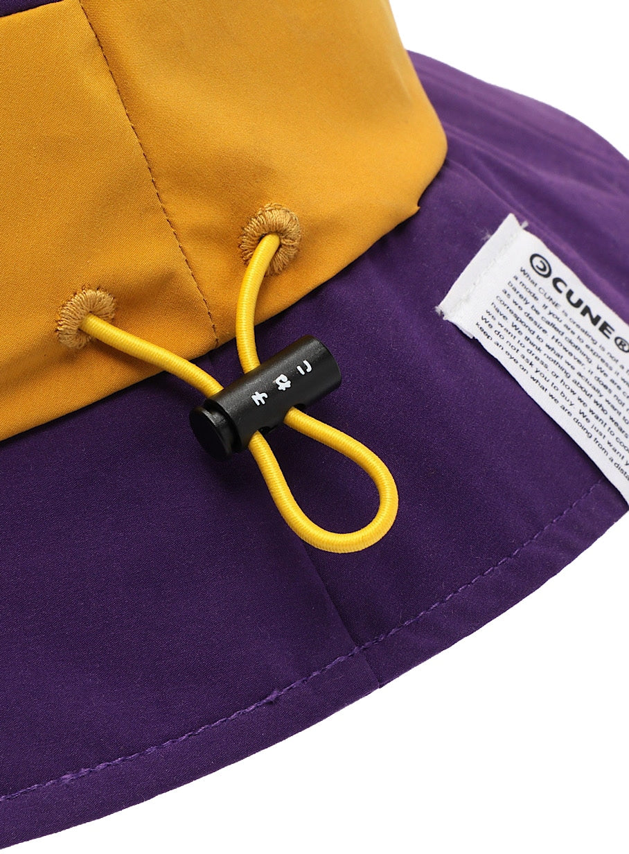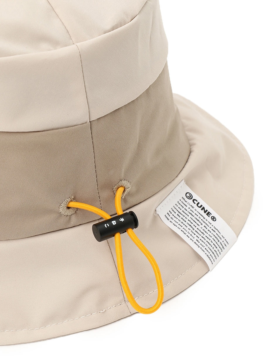 タフタ素材を使用した切替バケットハット。後頭部にはダーツが入っており、ストレッチコードとオリジナルストッパーが付いています。裏面のテープには「ハットをかぶってごらんあそばせ」とプリントされています。