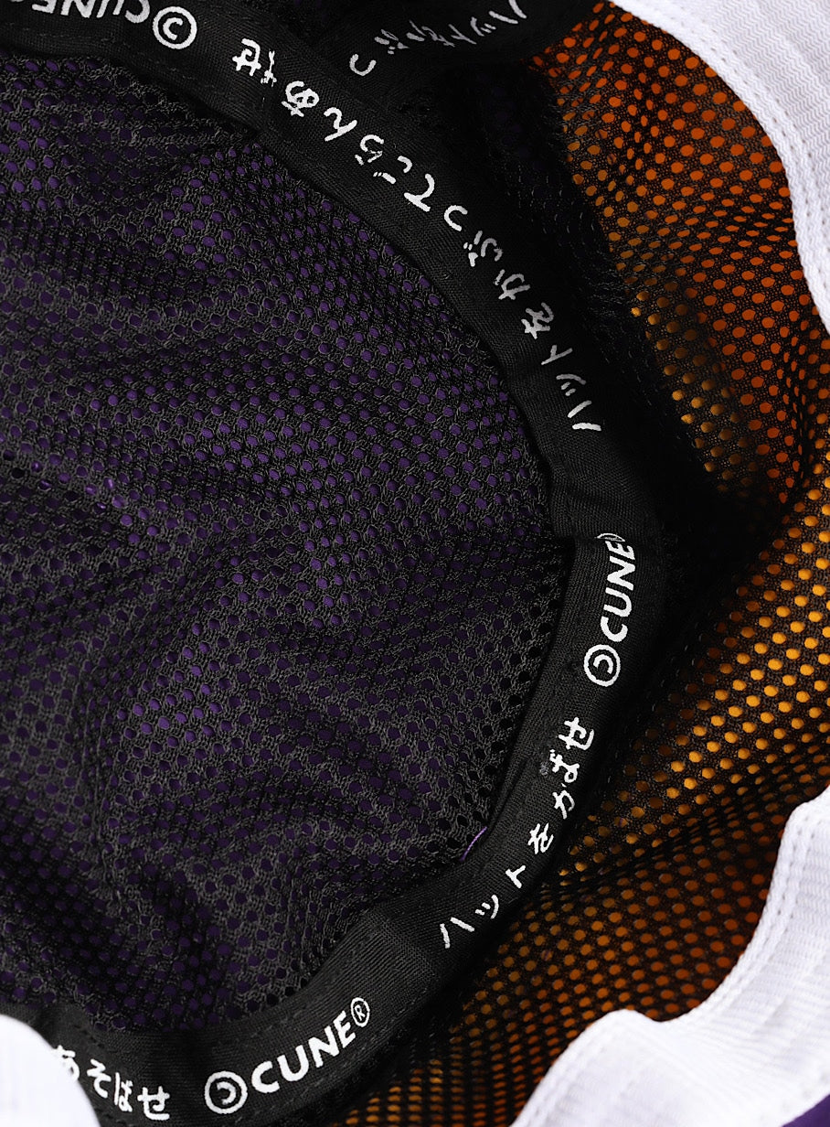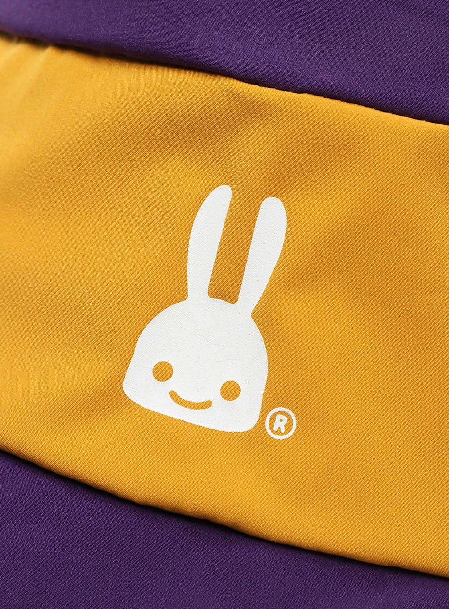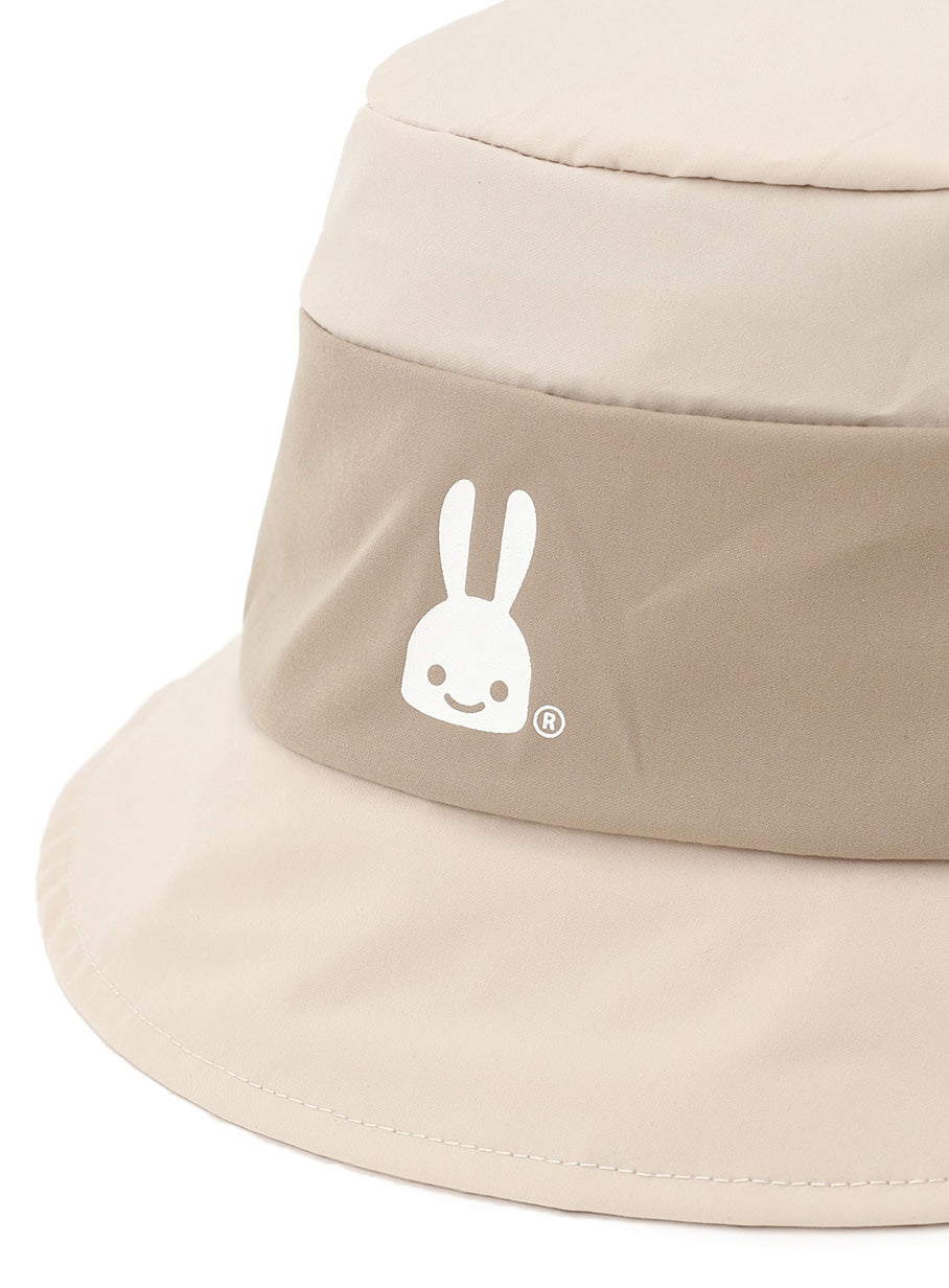 タフタ素材を使用した切替バケットハット。後頭部にはダーツが入っており、ストレッチコードとオリジナルストッパーが付いています。裏面のテープには「ハットをかぶってごらんあそばせ」とプリントされています。