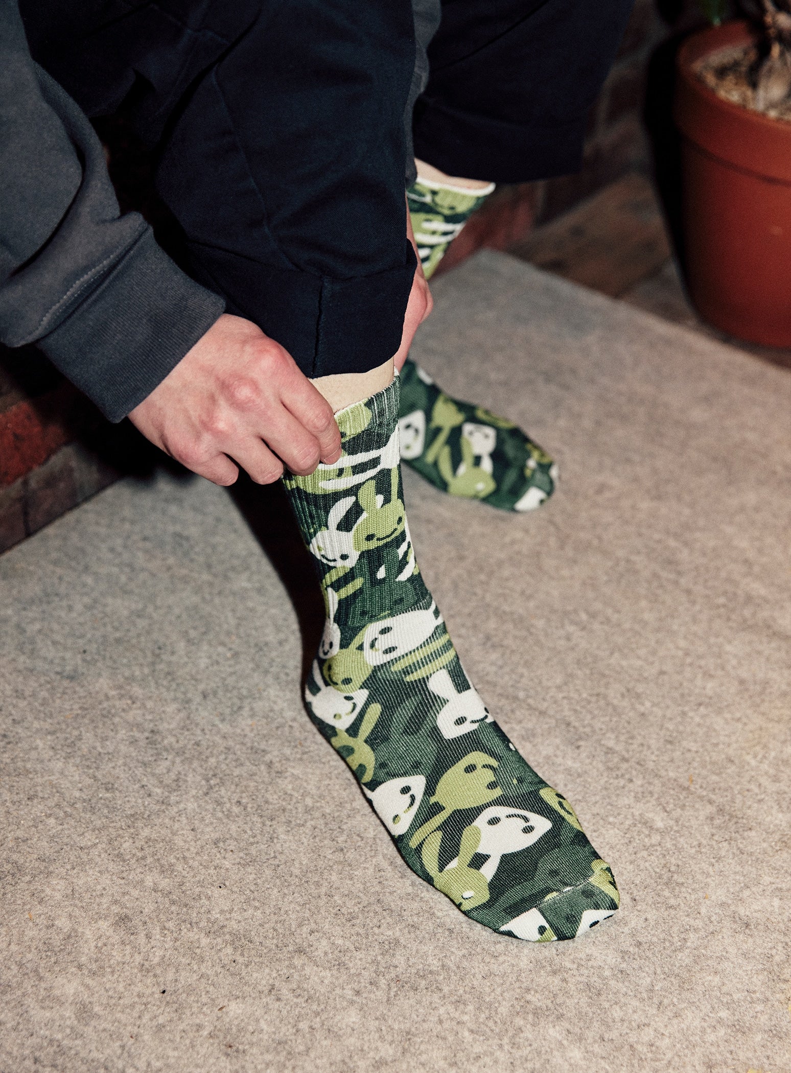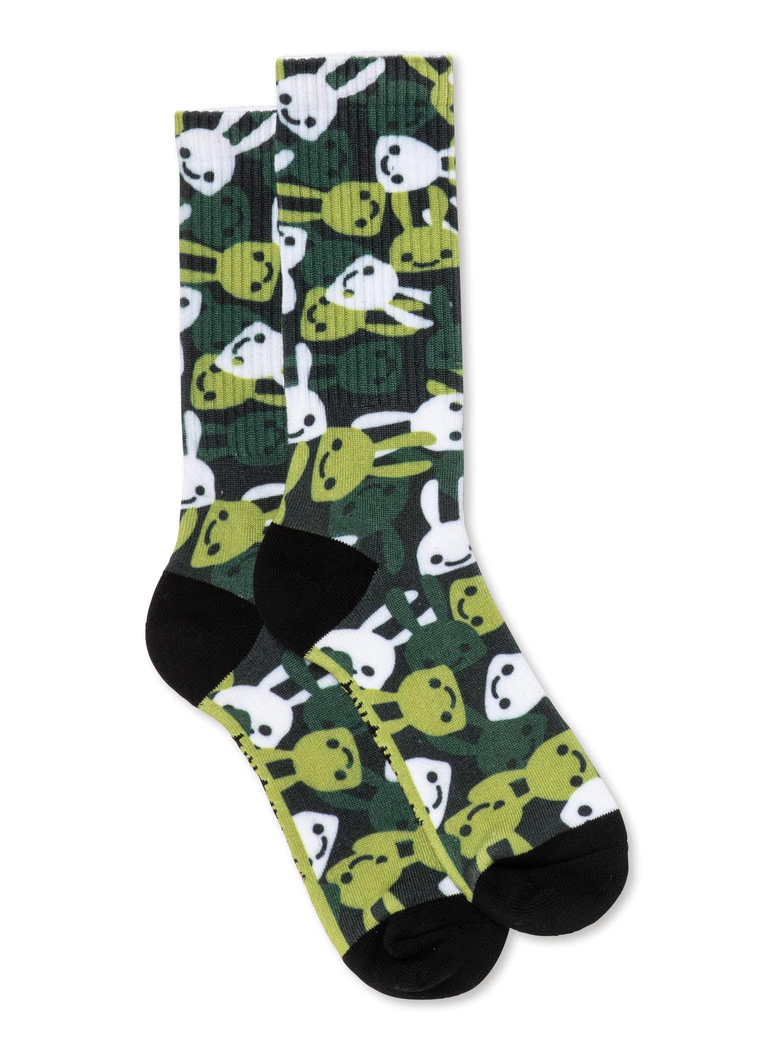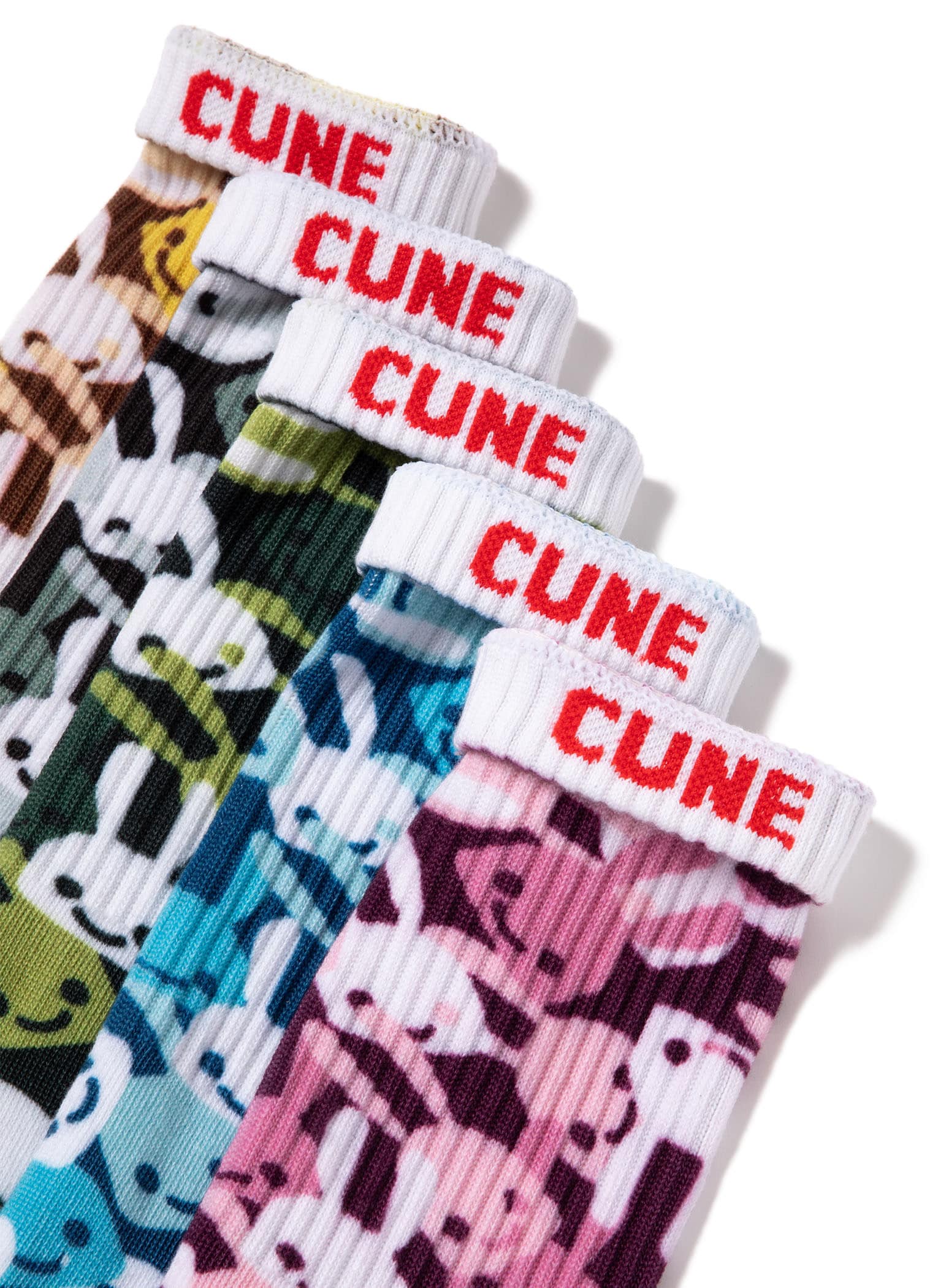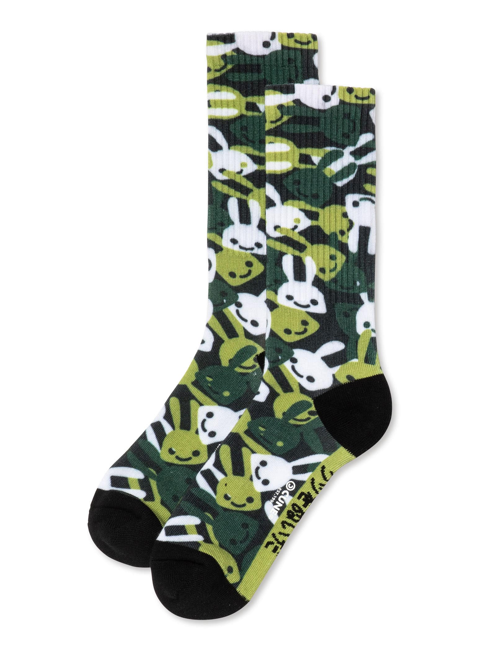 ランダムうさぎ柄のソックス。履き口を折り返した部分に「CUNE」と書いてあり、足の裏部分には「クツをぬいだ」と書いてあります。適応サイズは24cm~27cmです。