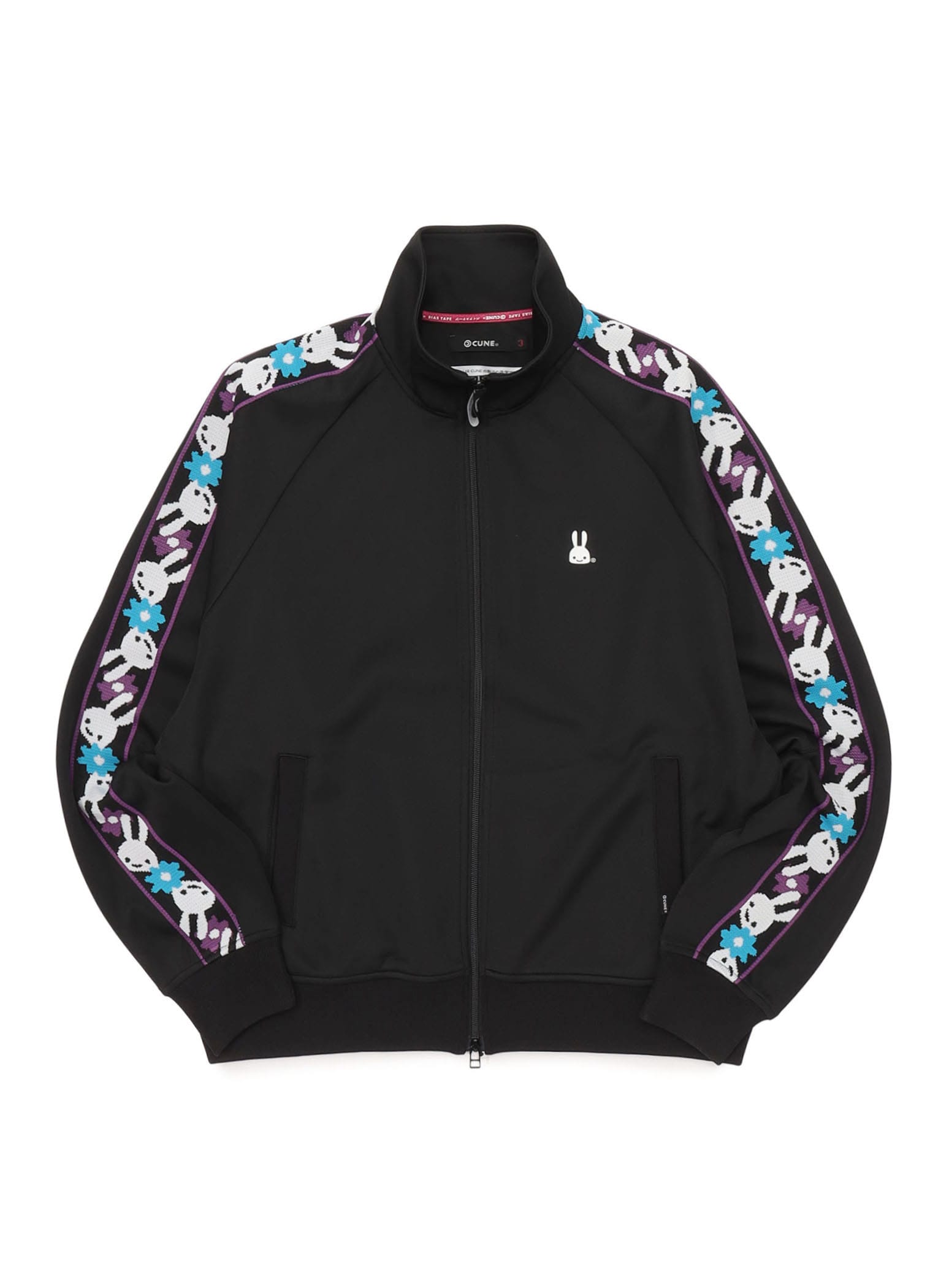 両袖にオリジナルテープが斜めに配置されたトラックジャケット。肘と脇腹にはあまり意味のなさそうなダーツが配置されています。前あきはダブルジップ仕様になっているので上下から開閉が可能。