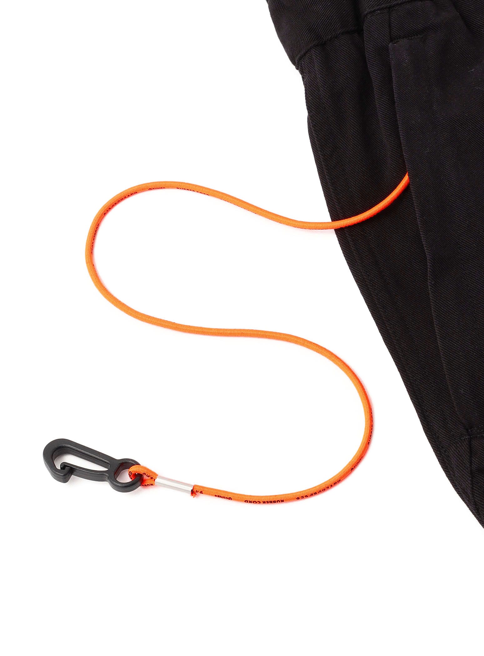 コットンツイルを使用した<CUNE RELAX WORK WEAR> CUNE WORK SHORTS。ウエストにはゴムと紐が入っています。腰ポケットにはジップがついており、後右ポケットにはベルクロとタブを搭載しいています。膝にはタックが入っており、裾にはテープが通してあるので絞って着用することも可能です。ポケット内にはカラビナ付きのオリジナルゴムコードが内蔵されており、何かしらを止めつけることができます。