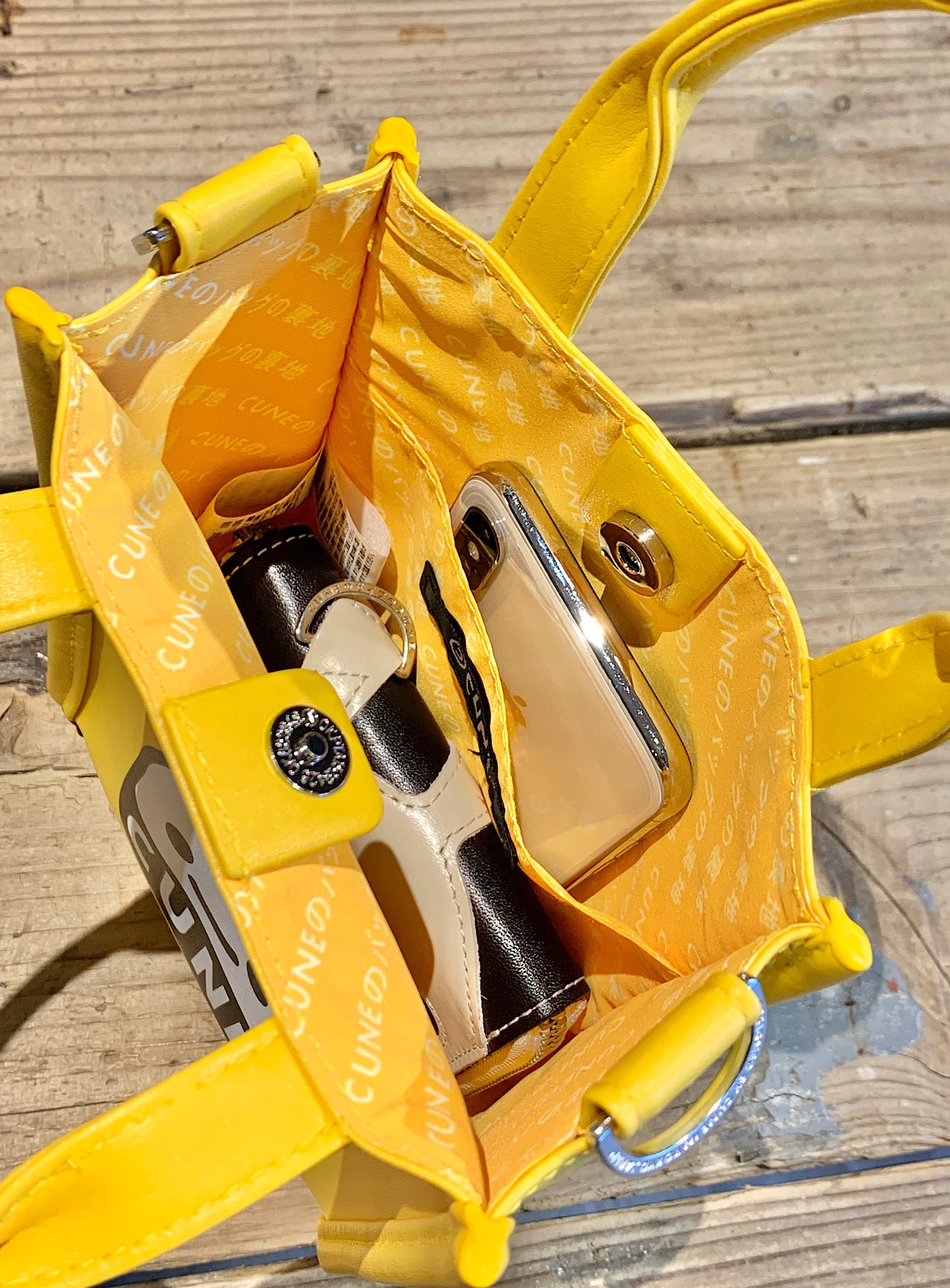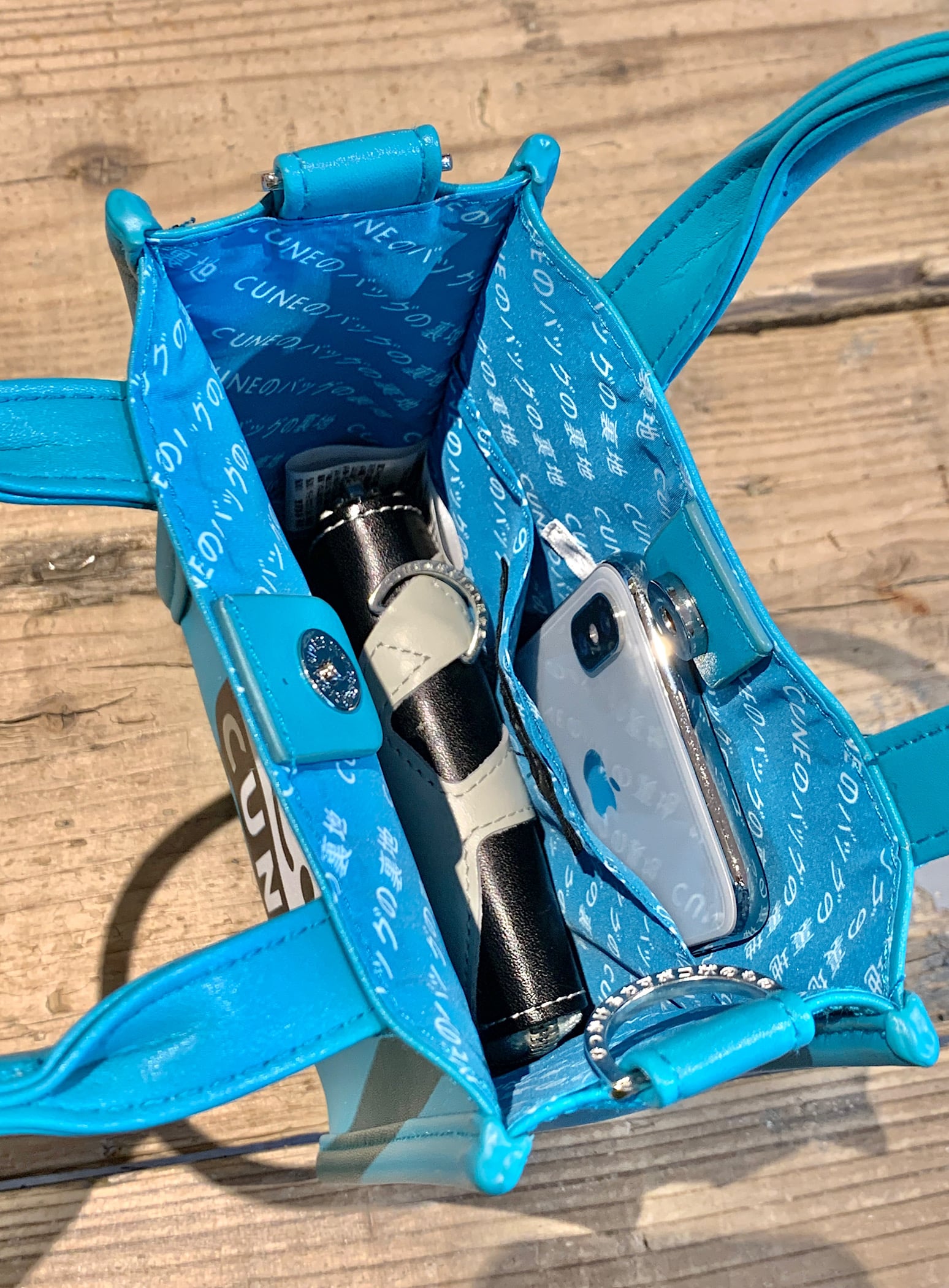ミニミニサイズのハンドバッグ。ショルダーは取り外し可能です。内側は仕切りが1箇所とCSS(CUNE SOUND SYSTEM)を搭載しています。CSSは縫い込まれているので取り出すことができません。開口部はマグネットボタンで留められる仕様です。